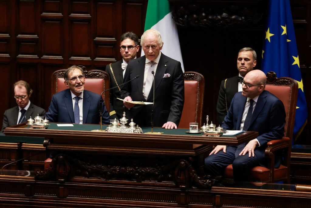 Charles III s’est posé en héraut de la paix et de la démocratie mercredi devant le Parlement italien à Rome, où il est en visite d’Etat, avant de fêter son 20e anniversaire de mariage avec Camilla lors d’un dîner de gala.”La paix ne doit jamais être tenue pour acquise”, a affirmé le roi d’Angleterre, premier monarque britannique à avoir l’honneur de s’exprimer devant les deux chambres du Parlement réunies en session conjointe.”La Grande-Bretagne et l’Italie sont aujourd’hui unies dans la défense des valeurs démocratiques”, a affirmé le roi âgé de 76 ans, qui s’est d’abord exprimé dans la langue de Dante avant de poursuivre en anglais.”Nos pays sont tous deux aux côtés de l’Ukraine (…) et ont accueilli des milliers d’Ukrainiens cherchant refuge”, a-t-il ajouté.Le roi, qui effectue en Italie sa 18e visite officielle mais sa première depuis son couronnement en 2023, a également mis en avant la coopération de Londres avec Rome et Tokyo sur le projet d’avion de combat du futur. Ce projet “créera des milliers d’emplois dans nos pays et en dit long sur la confiance que nous plaçons les uns dans les autres”, a-t-il souligné.Fervent militant du développement durable et de la lutte contre le réchauffement, le souverain a aussi évoqué les bouleversements climatiques de la planète qui provoquent “des sécheresses en Sicile et des inondations dans le Somerset”.”Les tempêtes extrêmes, qui ne surviennent normalement qu’une fois par génération, reviennent maintenant chaque année. D’innombrables espèces végétales et animales sont menacées d’extinction”, a-t-il déploré.- Théâtre -Cette visite d’Etat de quatre jours intervient moins de quinze jours après que Charles a été brièvement hospitalisé pour des effets secondaires de son traitement contre le cancer.Mercredi matin, Charles a eu une brève rencontre privée avec la Première ministre Giorgia Meloni, dans le cadre champêtre de la Villa Doria Pamphili.Après une inspection de la garde d’honneur, ils ont posé pour une photo alors que les drapeaux britannique, italien et de l’UE flottaient sur le toit de la villa. Mme Meloni défend l’aide à l’Ukraine depuis l’invasion russe en février 2022 malgré de fortes oppositions au sein de sa coalition ultraconservatrice.Le roi a ensuite été conduit à bord de sa Bentley à Testaccio, un quartier populaire de Rome. Dans un ancien abattoir accueillant des événements culturels, il a rencontré des étudiants en théâtre qui ont interprété un extrait d””Othello” de Shakespeare en italien.A l’extérieur du lieu, la plupart des habitants du quartier semblaient indifférents à sa venue.- Dîner de gala -Benedetta Ciarlo, 21 ans, s’est montrée plus enthousiaste, d’autant qu’elle est venue spécialement de Bénévent, près de Naples, pour voir le roi.”Mon personnage royal préféré était le prince Philippe, maintenant c’est Charles,” a-t-elle dit.Pendant ce temps, Camilla a rendu visite à des écoliers apprenant l’anglais et a distribué des prix aux gagnants d’un concours littéraire du British Council.En marge de leur visite, le roi Charles et la reine Camilla ont pu rencontrer le pape François, en convalescence après une pneumonie. “Le pape a exprimé ses meilleurs voeux à Leurs Majestés à l’occasion de leur anniversaire de mariage et a souhaité en retour un prompt rétablissement à sa majesté” Charles III, a indiqué le Vatican dans un communiqué.”Leurs Majestés étaient ravies que le pape soit en assez bonne santé pour les accueillir et qu’il ait pu leur exprimer ses meilleurs voeux en personne”, a déclaré un porte-parole du palais de Buckingham. La rencontre avait été initialement annulée à cause de l’état du souverain pontife.Le couple royal a ensuite célébré son 20e anniversaire de mariage lors d’un dîner de gala au palais du Quirinal, la résidence officielle du président de la République Sergio Mattarella, en compagnie de 150 invités. “Je dois dire que c’est vraiment très gentil de votre part, Monsieur le Président, d’organiser ce petit dîner romantique aux chandelles pour deux”, a plaisanté Charles lors de son toast, dans lequel il a alterné entre l’anglais et l’italien.Au menu du dîner figuraient des pâtes farcies aux aubergines, du loup de mer et des artichauts frits, à la romaine.