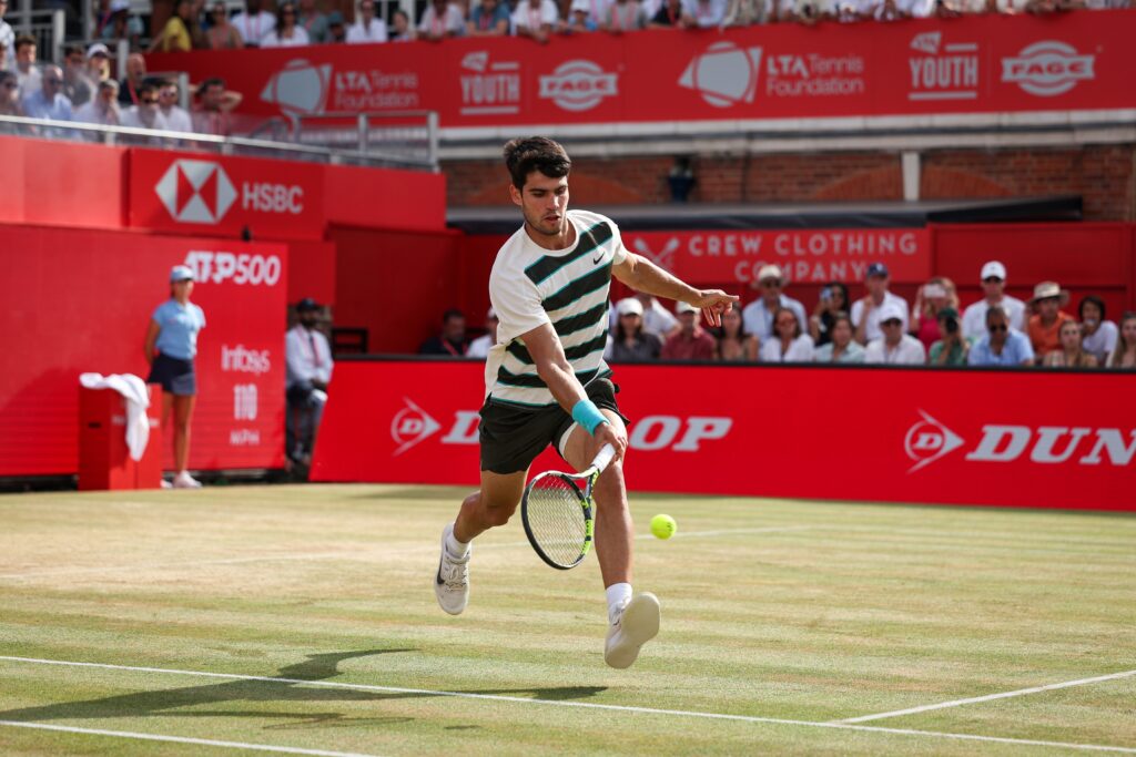 Le N.2 mondial Carlos Alcaraz a disposé aisément de Roberto Bautista samedi sur l’herbe du Queen’s et se retrouve en finale pour le cinquième tournoi consécutif, avec le Tchèque Jiri Lehecka en futur adversaire.La préparation pour Wimbledon (30 juin-13 juillet) se poursuit sans accroc pour le double tenant du titre, victorieux de son compatriote espagnol en deux manches 6-4, 6-4 et près d’une heure et trente minutes.Le phénomène de 22 ans s’est montré discipliné et intraitable au service pour empocher sa 250e victoire en carrière, la 17e d’affilée et la 42e de la saison, plus haut total parmi les joueurs du circuit.Son adversaire de 37 ans, classé au 51e rang mondial, a peut-être payé les efforts fournis dans la semaine, où il a terminé tous ses matches en trois manches, sous de fortes chaleurs.Alcaraz va jouer une finale pour le cinquième tournoi consécutif dans lequel il est engagé, après ses titres sur la terre battue de Monte-Carlo, Rome et Roland-Garros, et celle perdue à Barcelone.Face à lui se présente Jiri Lehecka, 23 ans et 30e mondial, sur le point de disputer sa première finale sur gazon.Le Tchèque a contrarié le public du Queen’s samedi en éliminant en trois manches (6-4, 4-6, 7-5) le numéro 1 britannique Jack Draper, diminué par une inflammation des amygdales depuis plusieurs jours.”Aujourd’hui, c’était probablement le pire. Ai-je pensé au forfait? Non, pas du tout. Je suis en demi-finale au Queen’s, je serais probablement entré sur le court avec une jambe cassée”, a affirmé l’Anglais en conférence d’après-match.Malgré sa défaite, Draper est assuré de grimper à la quatrième place du classement ATP, lundi, et donc d’éviter les épouvantails Jannik Sinner et Alcaraz lors des premiers tours de Wimbledon.Quant à Lehecka, il jouera dimanche sa cinquième finale sur le circuit ATP, la première sur un tournoi 500 et la première sur une autre surface que du dur.