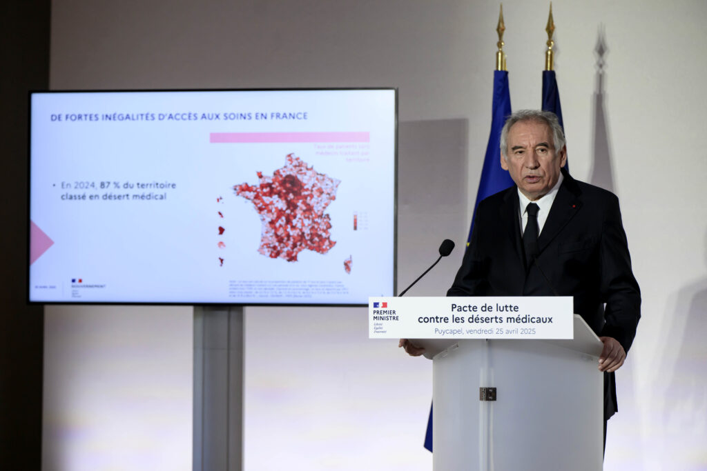 Quel remède aux déserts médicaux ? A l’occasion d’un déplacement dans le Cantal vendredi, François Bayrou a préconisé d’imposer jusqu’à deux jours par mois de temps de consultation aux médecins dans les zones prioritaires du territoire.”Chaque médecin généraliste ou spécialiste qui exerce dans un territoire bien pourvu devra consacrer un ou deux jours par mois à des consultations dans les zones qui sont les plus en difficulté”, a annoncé le Premier ministre au terme d’une visite à Puycalvet, une petite commune rurale à une quarantaine de kilomètres d’Aurillac.Près de 30 millions de consultations par an seraient ainsi réorientées là où il y en a besoin. Cette mesure concernerait tous les médecins, qui pourront se faire remplacer dans leur cabinet principal. “Il y aura des contreparties financières”, “a contrario, les médecins qui refuseraient se verront pénalisés”, a précisé une source gouvernementale.Les syndicats de médecins ne sont pas emballés. “Il ne faut pas que ce soit l’idée de contrainte, d’obligation”, regrette auprès de l’AFP Agnès Giannotti, présidente de Médecins généralistes (MG France, majoritaire chez les libéraux). “On fait au quotidien vraiment le maximum de ce qu’on peut faire pour soigner les gens. Il faut nous protéger, il faut nous aider, il ne faut pas nous contraindre et nous menacer”, poursuit la responsable.- “Un peu tardif” -Patricia Lefébure, présidente de la Fédération des médecins de France (Fmf), rappelle à l’AFP que son organe “proposait déjà ce principe de solidarité il y a 10-15 ans”. “C’était quand il y avait encore pas mal de médecins. Mais aujourd’hui, il n’y a plus de médecin, c’est un peu tardif” grince-t-elle.Ce principe de solidarité du corps médical est aussi présenté par l’exécutif comme une alternative à la “fin de la liberté d’installation” des médecins, mesure induite dans une proposition de loi transpartisane dont l’article phare a été adopté contre l’avis du gouvernement début avril par l’Assemblée nationale, avant l’examen de la suite du texte prévu début mai.Ce texte provoque la colère des médecins libéraux, étudiants en médecine, internes et jeunes médecins, pour qui ce projet “mettra à mal l’attractivité de la médecine libérale, aujourd’hui le premier rempart du système de santé”. Dans la mesure où ce projet de loi n’est pas retiré, les appels à la grève dès le 28 avril et à manifester partout en France le 29 avril sont maintenus. Pour présenter son “pacte de lutte contre les déserts médicaux”, François Bayrou a donc choisi le Cantal, département passé de 160,6 médecins généralistes pour 100.000 habitants en 2010 à 139,4 en 2025 selon l’Ordre des médecins. – “Fracture” -En 2024, 6 millions de Français n’avaient pas de médecin traitant. “Les déserts médicaux sont à notre avis, le symptôme le plus grave de la fracture que nous avons laissée se créer au travers du temps sur notre territoire”, constate François Bayrou.”Des pathologies qui pourraient être traitées rapidement, perdurent ou s’aggravent, faute d’avoir été soignées à temps”, regrette encore le Premier ministre. Outre la mesure phare des deux jours par mois, le plan présenté vendredi comprend trois autres “axes”. Le premier traite de la formation. L’idée est de “permettre aux plus de jeunes possible d’accéder aux études de santé, au plus près de leur territoire”, de “recruter dans les territoires ruraux ou moins favorisés”, déroule une source gouvernementale. Un nouveau médecin s’installe plus volontiers dans son territoire d’origine: 50% des médecins généralistes formés exercent à moins de 85 km de leur lieu de naissance, une installation sur deux est située à moins de 43 km de l’université d’internat.Le gouvernement veut par ailleurs confier de nouveaux actes aux autres professionnels de santé. Un patient souffrant de rhinite allergique saisonnière pourrait ainsi se rendre en pharmacie pour recevoir son traitement avec une ordonnance échue.Par ailleurs, l’exécutif souhaite, dans le délai d’un mois, une cartographie des zones particulièrement prioritaires, dites “zones rouges”. Ce travail va être confié aux agences régionales de santé (ARS), “en lien étroit avec les préfets et les élus locaux”, afin de “définir département par département les zones les plus prioritaires” pour l’application de ce plan.
