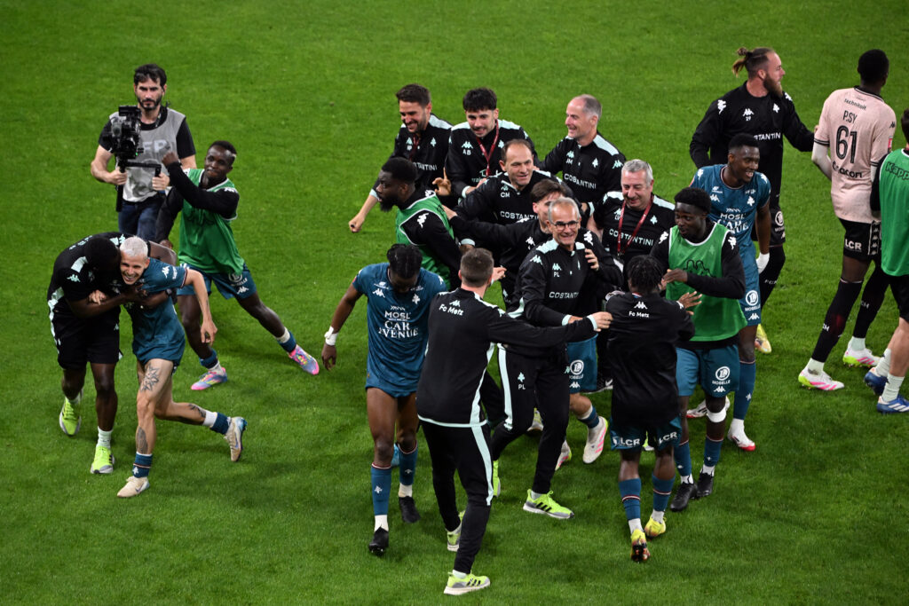 Au bout du suspense, Metz a obtenu le droit de remonter en Ligue 1 en renversant Reims (3-1) en prolongation jeudi soir au Stade Auguste-Delaune, poussant le club de la Marne en Ligue 2.Après une saison à végéter en deuxième division, les Grenats ont obtenu ce dont ils rêvaient: retrouver l’élite, un an après l’avoir quittée au terme, déjà, de barrages, à l’époque contre Saint-Etienne.Le chemin fut long, dur et sinueux, de la troisième place de Ligue 2 à cette double confrontation souvent fermée, tout le temps tendue, contre les Rémois, en passant par un premier match de play-off étouffant contre Dunkerque (1-0), mais l’objectif est atteint.A l’inverse, cette descente constitue une catastrophe pour le Stade de Reims, plutôt habitué à regarder vers les places européennes ces dernières saisons.Elle conclut une saison chaotique, ponctuée d’un bon début de saison, puis d’une dégringolade au classement jusqu’au limogeage de l’entraîneur Luka Elsner, qui n’a pas enraillé la chute, mais aussi d’une finale de Coupe de France.La parenthèse entre ces deux matches de barrage ne fut pas enchantée puisque le club de la Marne a été battu largement par Paris (3-0) au Stade de France.Mais elle a au moins permis de réconcilier, un temps, l’équipe avec ses supporters, une semaine après le boycott du barrage aller à Metz (1-1). Le Stade Auguste-Delaune, comble pour l’occasion, a rugi comme rarement pour encourager ses joueurs, auteurs, pour une fois d’une très bonne entame de match.Les Rémois ont eu l’occasion, par Mory Gbané (5e) puis Keito Nakamura (7e), d’ouvrir le score, mais ont manqué de justesse technique. Ces premières occasions étaient prémonitoires.- Un succès signé Gauthier Hein -Ils ont tout de même réussi à ouvrir le score grâce au jeune Ange Martial Tia d’une frappe à bout portant au bout d’un action un peu confuse, mais libératrice (57e). Le milieu de terrain de 18 ans a fait exploser le stade et le banc rémois, venu célébrer avec lui.Le Stade de Reims se dirigeait alors vers un grand soulagement. Mamadou Diakhon a même eu une occasion en or de faire le break, après une superbe percée de Jordan Siebatcheu (75e).Puis tout a basculé quand Matthieu Udol a égalisé d’une frappe croisée que Yehvann Diouf n’a pu qu’effleurer (78e). En bon capitaine, il avait déjà montré la voie la semaine dernière en ouvrant le score à Metz.Les deux équipes ont alors eu des occasions jusqu’au festival de Gauthier Hein lors de la prolongation. Le milieu offensif a d’abord aspiré toute la défense rémoise avant de donner une passe décisive délicieuse d’une talonnade pour Alpha Touré (110e).Puis il a enterré les espoirs rémois en lobant Yehvann Diouf d’une frappe de plus de 35 mètres (114e).Un fossé séparait alors les ultras messins, qui lançaient “On est en Ligue 1”, et ceux de Reims, qui ont entonné des chants hostiles envers le président du club Jean-Pierre Caillot, principal coupable selon eux du marasme de leur club.Sur la pelouse, le match était plié. Spécialiste européen de l’ascenseur, Metz retrouve la Ligue 1 avec la volonté, cette fois d’y rester. Reims, club historique du championnat de France, plonge en Ligue 2.