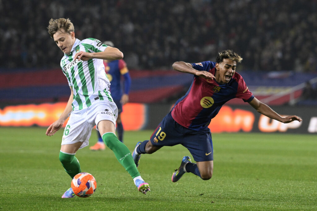 Largement dominateur, le FC Barcelone n’a pu faire mieux qu’un match nul samedi (1-1) sur sa pelouse face au Betis Séville et a laissé filer une occasion en or de creuser l’écart avec son grand rival le Real Madrid, battu (2-1) par Valence.Malgré cela, le Barça (1er, 67 points), qui venait d’enchaîner neuf victoires en championnat, reste idéalement placé dans la course au titre, avec désormais quatre longueurs d’avance sur le Real (2e, 63 points) en tête de la Liga.Le jeune milieu espagnol Gavi avait ouvert le score dès la 8e minute d’une frappe croisée dans le petit filet au terme d’un beau mouvement collectif, mais les hommes d’Hansi Flick, toujours invaincus en 2025, se sont laissés surprendre sur un corner repris de la tête par le défenseur brésilien Natan (17e, 1-1).Ce point permet au Betis (5e, 48 points), l’équipe en forme du moment en Liga, de s’emparer provisoirement de la cinquième place, juste devant Villarreal (6e, 47 points), qui affronte dimanche l’Athletic Bilbao (4e, 53 points) dans l’autre choc de cette 30e journée.- Le Real s’en sort bien -Battu sur le fil par Valence (2-1) à domicile, le Real Madrid s’en tire finalement plutôt bien, car cette cinquième défaite de la saison en Liga aurait pu permettre au Barça de s’envoler vers le titre, à huit journées de la fin.Auteur d’une prestation bien terne à trois jours du quart de finale aller de la Ligue des champions à Arsenal, le géant espagnol s’est incliné sur un but de l’attaquant espagnol Hugo Duro à la 95e minute.Mené à la mi-temps après l’ouverture du score de l’ancien Lyonnais Mouctar Diakhaby de la tête (15e, 1-0), le Real avait égalisé sur corner en seconde période grâce au Brésilien Vinicius Junior (50e, 1-1), qui s’est racheté de son pénalty raté en début de match (13e) en inscrivant son 104e but sous le maillot merengue, égalant son compatriote Ronaldo.Encore peu convaincants collectivement, les hommes de Carlo Ancelotti auraient néanmoins pu s’imposer grâce au talent de Kylian Mbappé, seul rescapé du naufrage merengue, mais l’attaquant français, a manqué de réussite devant le but (36e, 37e, 48e, 49e, 68e), butant notamment sur le portier géorgien Giorgi Mamardashvili, impérial sur sa ligne.”Ce sera désormais plus difficile de lutter pour le titre, mais nous allons nous battre jusqu’au bout. (…) Ce n’est pas une question de football, ni de physique, nous avons eu un tas d’occasions, mais nous avons manqué d’efficacité. Et défensivement, en ce moment, nos adversaires n’ont pas besoin de beaucoup travailler pour marquer des buts contre nous”, a réagi Ancelotti en conférence de presse.”Nous avons eu des défaites méritées cette saison, celle-ci n’en est pas une”, a-t-il ajouté.- Gérone chute encore -Le champion d’Espagne en titre, habitué aux renversements de situation les plus épiques et qui restait sur deux succès étriqués en Liga contre Leganés (3-2) et Villarreal (2-1), et une qualification pour la finale de la Coupe du Roi arrachée en prolongation mardi face à la Real Sociedad, a cette fois été pris à son propre jeu, sur un contre conclu par l’entrant Hugo Duro, venu punir son ancien club au bout du temps additionnel.Battu (1-0) par Alavés (17e, 30 points) plus tôt dans l’après-midi, Gérone (13e, 34 points) a enchaîné un huitième match consécutif sans victoire et est désormais plus proche de la descente que des places européennes. Cette 30e journée se poursuit avec deux autres chocs dimanche, entre l’Atlético Madrid (3e, 57 points) et le Séville FC (11e, 36 points), et Villarreal (6e, 47 points) contre l’Athletic Bilbao (4e, 53 points).