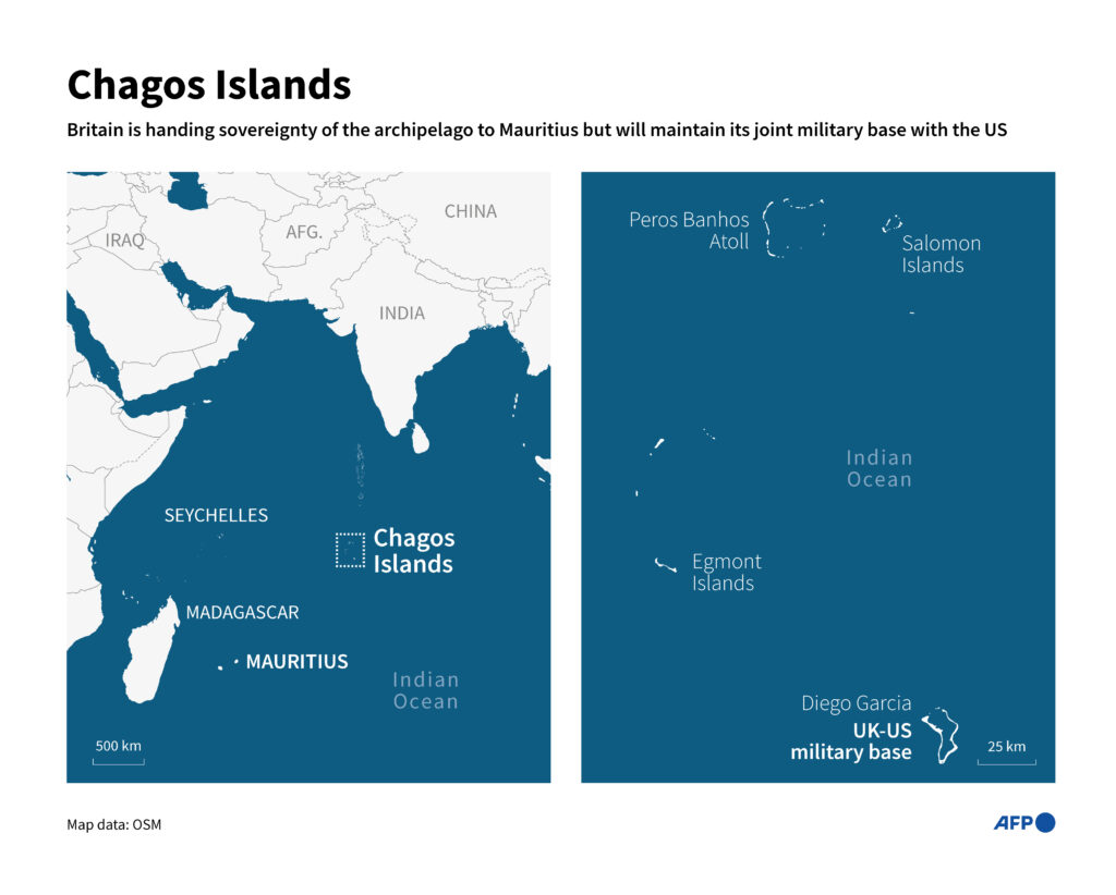 Britain separated the Chagos Islands from its colony Mauritius more than 50 years ago, expelling the entire population to make way for what has become one of the most important US military bases.Britain’s 1965 acquisition of the remote Indian Ocean archipelago has been disputed ever since, with the United Nations ruling in 2019 that the UK should hand back the roughly 55 islands and atolls.After British Prime Minister Keir Starmer on Thursday signed a deal — following legal wrangling — to return the islands to Mauritius, here are some key details about Chagos: – Indian Ocean colony -Located several hundred kilometres (miles) south of the Maldives, the Chagos Islands were colonised by France in the 18th century and African slaves were shipped in to cultivate coconuts and copra.In 1814, France was made to cede the islands to Britain, which in 1903 merged them with Mauritius, its colony around 2,000 kilometres (1,200 miles) to the southwest.After the abolition of slavery in 1834, Indian workers arrived and mixed with the first settlers.Only three of the islands were inhabited: Diego Garcia, Salomon and Peros Banhos.- Mass eviction -In 1965, Britain separated the Chagos islands from the rest of Mauritius, then a semi-autonomous British territory eyeing independence. Britain paid three million pounds for them, the equivalent of around 50 million pounds ($65 million) today.When Mauritius became independent three years later, the islands remained under British control and were renamed the British Indian Ocean Territory (BIOT).In 1966, Britain leased the islands to the United States for 50 years so that it could set up a military base. In 2016, the deal was extended to 2036.Between 1968 and 1973, around 2,000 Chagos islanders were evicted, described in a British diplomatic cable at the time as the removal of a “few Tarzans and Man Fridays”.Most were shipped to Mauritius and the Seychelles.Mauritius argued it was illegal for Britain to break up its territory and demanded the right to resettle former residents.- Strategic military base -The US military base on Diego Garcia, the largest island, became of major strategic importance during the Cold War.It offered proximity to Asia as an assertive Soviet navy was extending communist influence in the Indian Ocean.After the 1979 Iranian revolution, the United States expanded the base to receive more warships and heavy bombers.In recent years it served as a staging ground for US bombing campaigns in Afghanistan and Iraq.- Islanders take action -Chagos islanders living in Mauritius launched legal proceedings in 1975 against their expulsion, resulting in a 1982 payment of four million pounds in compensation along with land valued at one million pounds.There were no reparations for islanders settled in the Seychelles.In 2007, a British appeals court paved the way for Chagossians to return home but its decision was annulled by the upper House of Lords the following year.In 2016, the British government confirmed its opposition to the resettlement of Chagossians, including for reasons of defence, security and cost.Today, around 10,000 Chagossians and their descendants are divided between Mauritius, the Seychelles and Britain.- ICJ ruling -In 2010, Britain declared the islands part of a Marine Protected Area, arguing that people should not be permitted to live there.Diplomatic cables revealed by WikiLeaks quoted a British official as saying the plan “put paid to the resettlement claims of the archipelago’s former residents”.The move backfired as a UN arbitration tribunal declared it illegal in 2015. The International Court of Justice (ICJ) stated in 2019 that Britain had illegally split the islands and should relinquish control.Britain rejected the ruling, insisting that Mauritius was wrong to bring the case to court, and arguing the Diego Garcia base played a “vital role” in keeping the region safe.Later that year, a UN General Assembly resolution demanded Britain cede the islands.