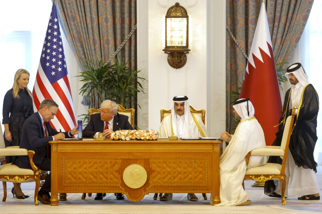 La compagnie aérienne Qatar Airwaysa passé commande portant sur 210 avions pour une valeur de 96 milliards de dollars à Boeing, a annoncé mercredi la Maison Blanche, à l’occasion de la visite de Donald Trump dans l’émirat.C’est un signal fort sur le plan commercial pour l’avionneur américain, qui se redresse progressivement après plusieurs années difficiles, même s’il peine à accélérer production et livraisons.Le titre de Boeing a pris 0,62% sur la séance de mercredi à la Bourse de New York. Il a atteint brièvement son plus haut niveau depuis 15 mois.Si Boeing et ses clients divulguent très rarement le prix des appareils achetés, il s’agit vraisemblablement de la plus grosse commande jamais enregistrée par Boeing en valeur.La plus conséquente en nombre d’appareils avait été passée, en 2023, par la compagnie Air India (220 avions), mais elle portait, en grande majorité sur des monocouloirs 737 MAX, alors que le contrat avec Qatar Airways concerne uniquement des gros porteurs 787 Dreamliner et 777X.”C’est la plus importante commande d’avion dans l’histoire de Boeing”, a assuré Donald Trump, précisant qu’elle représentait “plus de 200 milliards de dollars pour 160 avions, c’est fantastique, c’est un record”.L’écart entre le chiffre communiqué par le chef de l’Etat américain et la Maison Blanche s’explique par la différence entre les commandes fermes (160 avions) et les options (50).Qatar Airways a indiqué s’être engagé définitivement sur 130 Dreamliner et 30 777-9, de la famille des 777X.Le prix catalogue d’un 787 Dreamliner est d’environ 250 millions de dollars et celui d’un 777X aux alentours de 440 millions, ce qui induit un total inférieur aux chiffres communiqués dans tous les cas de figure, la ventilation des options n’ayant pas été précisée.Sollicité par l’AFP, Boeing s’est refusé à commenter l’annonce dans l’immédiat. Contacté, Qatar Airways n’a pas donné suite.Le 777X n’a pas encore reçu sa certification par l’Agence américaine de l’aviation civile (FAA). Il est en phase de tests et le groupe aéronautique table sur une première livraison en 2026.”Cela représente beaucoup d’avions”, a réagi Nicolas Owens, analyste de Morningstar, “mais si vous commandez un avion aujourd’hui, vous ne le recevrez pas avant au moins cinq ans.”Le carnet de commandes de l’avionneur cumulait ainsi, au total, 6.282 appareils à fin avril.- “Signe de confiance” -En proie à des problèmes de qualité depuis plusieurs années, Boeing a été contraint par la FAA de ralentir sa production du 737 MAX début 2024 après un incident en vol début janvier.La séquence a mené au départ, fin 2024, du directeur général Dave Calhoun, remplacé par Kelly Ortberg, un vétéran du secteur, qui a passé l’essentiel de sa carrière chez l’équipementier aérounautique Rockwell Collins.Boeing a également souffert d’une grève de plus de cinquante jours qui a bloqué deux usines cruciales entre mi-septembre et début novembre.”C’est une bonne nouvelle, mais Boeing ne va rien gagner sur ces avions avant longtemps”, a insisté Nicolas Owens, pour qui l’inclusion du 777X est “un signe de confiance émanant d’un client de longue date”. Sur les quatre premiers mois de l’année, le groupe a enregistré 261 commandes nettes.”Ils avaient besoin de se reprendre en main et il semble qu’Ortberg soit en train d’y réussir”, selon Nicolas Owens.La commande de Qatar Airways intervient quelques heures seulement après que les autorités chinoises ont autorisé la reprise des livraisons d’avions Boeing aux clients chinois.Elles avaient été suspendues mi-avril en réponse aux droits de douane imposés par Donald Trump aux produits chinois importés aux Etats-Unis.Les deux pays ont accepté lundi de réduire drastiquement ces tarifs douaniers durant 90 jours, le temps de parvenir à un accord commercial.L’annonce de la commande a été faite mercredi alors que le président américain signait une série d’accords à Doha aux côtés de l’émir du Qatar, cheikh Tamim ben Hamad Al-Thani.Certains portaient sur la défense, notamment la fourniture de drones MQ-9B.Lors de sa première étape dans la région, à Ryad, il a créé la surprise en annonçant la levée des sanctions visant la Syrie et en rencontrant son président islamiste, Ahmad al-Chareh. A Doha, Donald Trump a reçu un accueil tout aussi fastueux qu’à Ryad.L’émir du Qatar s’est déplacé à l’aéroport pour l’accueillir, et l’avion présidentiel américain a eu droit à une escorte d’avions de combat qataris.Mais ce passage à Doha a pour arrière-plan un scandale politique.L’opposition démocrate aux Etats-Unis reproche au milliardaire d’avoir accepté “le plus gros pot-de-vin étranger de l’histoire récente”.En cause, un Boeing 747-8 offert à Donald Trump par la famille royale qatarie pour remplacer au moins provisoirement son avion officiel, et pour l’utiliser après son mandat.
