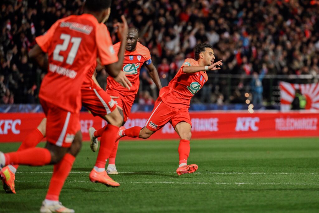 Après avoir éliminé Grenoble et Lorient, Cannes, qui évolue en National 2, s’est offert Guingamp (3-1), une troisième équipe de Ligue 2, pour se qualifier mardi en demi-finale de la Coupe de France.Cannes ne s’arrête donc plus. L’histoire est exceptionnelle pour Damien Ott et ses joueurs, invaincus depuis le 19 octobre dernier, leaders de leur poule de National 2 (équivalent de la 4e division), et protagonistes majeurs de cette Coupe de France, dont ils vont jouer les demi-finales, les 1er et 2 avril prochains.D’entrée, la formation guingampaise, 5e en L2, a pourtant pris possession du terrain cannois. Avec Hugo Picard, virevoltant sur le côté gauche et un milieu très physique, les joueurs de Sylvain Rippoll ont dominé le début de rencontre. D’ailleurs, la frappe du gauche de Amine Hemia a heurté la barre transversale de Fabio Vanni, le gardien cannois (10e). Malgré ce début de match compliqué, les Cannois ne sont pas sortis de leur match. Et progressivement, sous les coup de boutoir de l’avant-centre Julien Domingues, et surtout du feu follet Chafik Abbas, ils ont même fait reculer des Bretons, rapidement saoulés de coup. Après un déboulé de Abbas, le gardien guingampais, Babacar Niasse, a détourné en corner (21e). Mais dans la foulée, l’attaquant cannois est encore allé provoquer son vis-à-vis Dylan Ourega. Mais cett fois, il a repiqué dans l’axe pour décocher une frappe soudaine et victorieuse au premier poteau (1-0, 23e).- 11e but de Domingues -Fidèles à leurs principes, les Azuréens ont continué d’attaquer. Et comme ils maîtrisent l’art du contre à merveille, à chaque fois, ça a été dangereux. D’abord Matthis Riou a sauvé les siens en dégageant sur sa ligne un tir de Jonathan Mambu (28e). Et si Hemia s’est encore illustré par une tentative déviée que Vanni a tout juste détournée (29e), les 8.000 spectateurs ont hurlé de plaisir une minute plus tard. Face à Dives-Cabourg (5-3) au tour précédent, Domingues avait inscrit une ciseau de haut-vol. Face à Guingamp, son partenaire Cédric Goncalves a eu une inspiration de génie. Après une relance mal assurée de Niasse et une récupération cannoise haute, il a tenté et réussi un lob de plus de 50 mètres un gardien breton encore très mal inspiré (2-0, 30e). Mais il s’est parfaitement repris sur une nouvelle vague azuréenne et une reprise à bout portant de Domingues (34e). Cet arrêt aurait d’ailleurs pu être le tournant de la rencontre.Car après la pause, et deux changements effectués par Ripoll, Guingamp a rapidement marqué. Jacques Siwe a repris le centre de Ourega, lâché par Abbas (2-1, 46e). Guingamp a poussé 20 minutes. Sans réussite. Et le meilleur buteur de la compétition, Julien Domingues, a inscrit son 11e but en neuf tours de Coupe de France avec Cannes. Après avoir été servi par Moussa Ndiaye, il a qualifié son équipe d’un malin ballon piqué (3-1, 69e) et ainsi écrit l’histoire du club, vainqueur de la compétition en 1932.