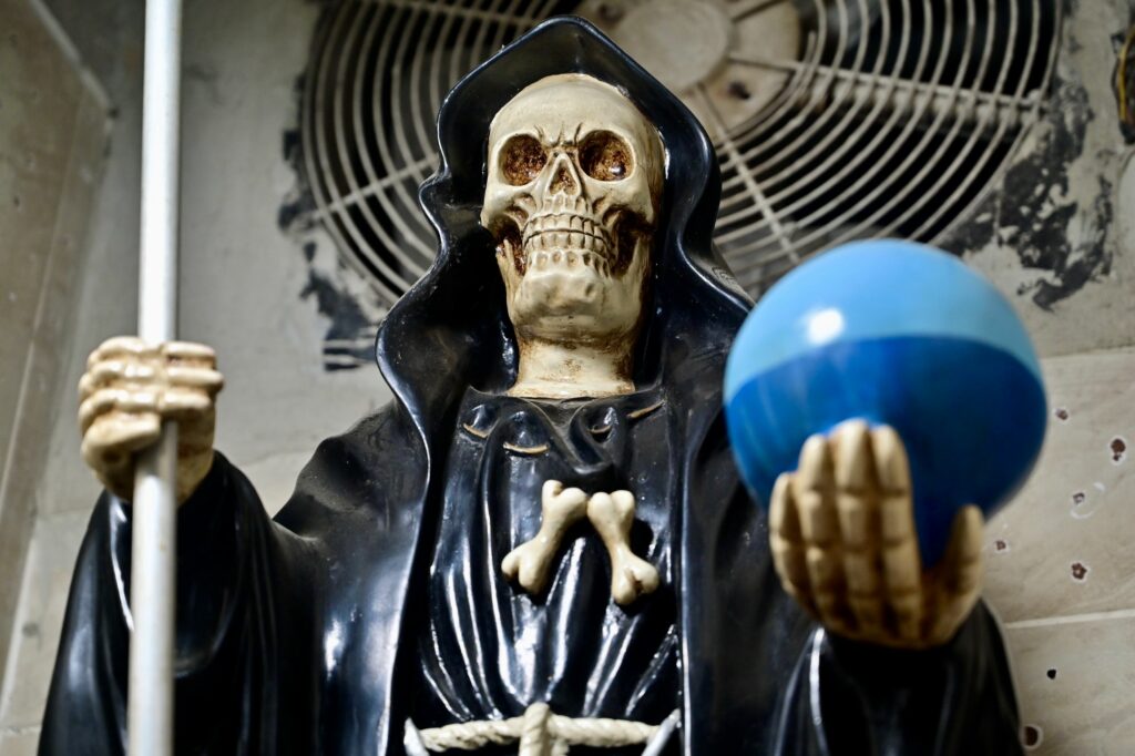 Portant gants et ruban rouge pour conjurer le mauvais sort, la police équatorienne inspecte avec appréhension un autel dédié à la Santa Muerte, sainte mexicaine de la mort adoptée par les gangs locaux, lors d’une descente dans une cache de narcotrafiquants.Faux dans la main droite et globe terrestre dans la main gauche, l’inquiétante statue d’un squelette enveloppé dans une cape est la dernière découverte en date des autorités, qui tombent régulièrement nez à nez avec la Santa Muerte dans des repaires de criminels de Duran et la ville voisine de Guayaquil, dans le sud-ouest de l’Equateur, où sévissent de puissantes mafias.Aux pieds de la sainte, des offrandes – argent, tabac, alcool, objets religieux – s’entassent, déposés par des délinquants cherchant sa protection.Les narcotrafiquants équatoriens “s’en remettent à elle pour ne pas se faire prendre et être invincibles”, explique à l’AFP Roberto Santamaria, colonel de la police de Duran, ville d’environ 300.000 habitants.En plus des offrandes, certains tatouent l’image de la sainte sur leurs bras ou portent des amulettes à son image autour du cou. Parfois, l’idolâtrie va encore plus loin. Un ancien membre de gang a raconté à l’AFP comment certaines de ses anciennes fréquentations ont commis des sacrifices humains.”Ils volaient des enfants d’autres villes et les sacrifiaient devant elle (la Santa Muerte) lorsqu’ils voulaient faire un gros coup,” a déclaré l’homme, qui a requis l’anonymat.- Origines – Le culte de la Santa Muerte remonte au 18e siècle, quand les indigènes vénéraient un squelette au centre du Mexique. Il a ensuite gagné l’Amérique centrale et d’autres pays. La sainte a trouvé un terrain fertile dans les quartiers pauvres de Duran, où le taux d’homicides a atteint 160 pour 100.000 habitants en 2024.Depuis son arrivée au pouvoir fin 2023, le président Daniel Noboa a lancé une offensive contre la criminalité, notamment à Duran considérée comme la capitale du crime en Equateur, pays situé entre la Colombie et le Pérou, les deux plus gros producteurs de cocaïne au monde.Le tour de vis sécuritaire du gouvernement, critiqué par les défenseurs des droits humains, comprend des états d’urgence autorisant le déploiement de militaires dans les rues.La police a retrouvé un autel dédié à la sainte dans environ six opérations anti-criminalité sur dix effectuées à Duran en 2024.Selon M. Santamaria, le culte de la Santa Muerte a pris racine auprès des narcotrafiquants équatoriens il y a six ans, lorsque le tristement célèbre cartel mexicain de Sinaloa a formé Los Choneros, l’un des 22 gangs locaux, en lui transférant ses croyances.- “Maux de tête” – Aussi connue sous le nom de Faucheuse ou Sœur Blanche, la Santa Muerte est une sainte de la guérison et de la protection également vénérée hors des gangs. Des milliers de Latino-Américains s’en remettent à elle pour un passage sûr vers l’au-delà. Comme le Mexique, l’Equateur est un pays largement catholique, mais cela n’empêche pas le syncrétisme religieux des habitants qui concilient leur religion et la croyance dans la Santa Muerte, dont des représentations sont vendues sur les marchés ou même en ligne. Les observateurs craignent que les personnes possédant des objets de la Santa Muerte ne soient à tort associés à des criminels face à la répression gouvernementale. “On criminalise déjà les gens pour leur appartenance raciale, pour leur pauvreté, maintenant on va aussi criminaliser les coutumes populaires?”, s’interroge la chercheuse en études sociales équatorienne Cristina Burneo. “En Equateur, il existe une liberté de culte et n’importe qui peut l’avoir, ce n’est pas un crime”, assure Roberto Santamaria.Témoignant de la portée de la sainte, il explique que beaucoup de ses officiers ont peur de s’approcher des autels. “Des policiers me disent qu’après les opérations, ils ont des maux de tête, commencent à se sentir malades et se sentent étourdis”, dit-il, en précisant que lui ne croit pas aux pouvoirs attribués à la sainte.Les statues trouvées par la police sur des scènes de crime ou lors de perquisitions ne sont détruites que s’il est avéré qu’elles contiennent de la drogue ou des munitions, précise-t-il.