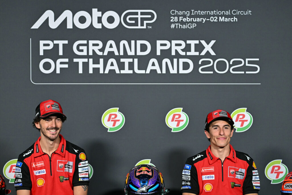 C’est sans le tenant du titre Jorge Martin, blessé, que le MotoGP débute une saison marathon ce week-end en Thaïlande où Marc Marquez, en quête d’un septième étoile dans l’élite, captera tous les regards pour sa première avec l’équipe officielle Ducati.A eux deux, ils cumulent huit titres de champion en MotoGP: qui de l’Espagnol Marquez, 3e du général en 2024, ou du vice-champion sortant italien Francesco Bagnaia, sacré en 2022 et 2023, prendra le dessus dans le box Ducati ?La nouvelle “Dream Team” sera certainement très scrutée dans la fournaise de Buriram, où il a fait plus de 35 degrés mi-février lors des tests d’avant-saison, dominés par Marquez.”Je suis au bon endroit si je veux me battre encore pour le titre”, a assuré le Catalan de 32 ans, qui a échangé les amabilités avec son coéquipier en conférence de presse. “Je dois apprendre de +Pecco+”, qui connaît mieux la maison Ducati, a-t-il insisté.”Ca sera une bataille intense, on sait à quel point Marc est fort”, a déclaré de son côté le Turinois, 28 ans. “Je signe tout de suite pour finir premier et deuxième à chaque course.”Si les deux pilotes se sont souvent battus aux avant-postes l’an dernier – Bagnaia disposait alors d’une Ducati 2024, Marquez n’avait que le modèle 2023 dans l’équipe satellite Ducati-Gresini, -, ils joueront désormais à armes égales sur les 22 circuits au programme cette année, un record.Une bataille annoncée à laquelle ne se joindra pas Jorge Martin en Thaïlande: le nouveau N.1, après sa première couronne en catégorie reine, a subi de grosses chutes ces dernières semaines, qui ont causé sept fractures en tout.Après l’opération du Madrilène à la main gauche en début de semaine, son équipe a exclu un retour au prochain Grand Prix, en Argentine dans deux semaines, sans évoquer de calendrier de reprise.- Grand chambardement -C’est la première fois depuis 2003 que le championnat lance sa saison dans cette partie du monde. Le GP du Qatar, qui ouvre la saison ces dernières années, a été décalé en avril en raison du ramadan.En Thaïlande, le défi sera de taille face à l’humidité rendant la chaleur étouffante. La séquence sera d’autant plus éreintante pour la moitié de la grille qui découvre une nouvelle équipe.Le championnat hérite en effet d’une grille chamboulée, marquée par un jeu de chaises musicales et l’arrivée de trois débutants: le Japonais Ai Ogura, champion en titre de Moto2, chez Aprilia-Trackhouse, l’Espagnol Fermin Aldeguer chez Ducati-Gresini, et le Thaïlandais Somkiat Chantra chez Honda-LCR.Dans les écuries d’usine, outre l’arrivée de Marquez chez Ducati et celle de Martin chez Aprilia, où il fera équipe avec l’Italien Marco Bezzecchi (ex-Ducati-VR46), la pépite Pedro Acosta a été promue chez KTM au côté du Sud-africain Brad Binder.Pour sa deuxième saison, l’Espagnol de 20 ans, encore en quête de sa première victoire en MotoGP, s’est révélé très véloce lors des essais face à ses aînés de la flotte KTM, qui comprend aussi l’équipe française Tech3.- Arsenal Ducati réduit -S’il a fort à parier que Ducati, championne en titre des constructeurs, dominera encore le plateau, elle ne comptera plus “que” quatre motos (contre six en 2024), en plus de ses deux navires amiraux officiels : les Gresini d’Aldeguer et d’Alex Marquez, le frère de Marc, et les VR46 des Italiens Franco Morbidelli et Fabio Di Giannantonio.L’écurie Pramac a quitté le giron Ducati pour faire courir des Yamaha, ce qui permet au constructeur japonais de se renforcer, lui qui a perdu sa place parmi les premières du plateau. La firme aux diapasons ne pouvait plus compter depuis 2023 que sur ses deux motos d’usine pour son programme de développement ce qui ralentissait sa progression par rapport à ses concurrentes.Suffisant pour que son champion du monde 2021, le Français Fabio Quartararo, revienne au sommet ? Les essais ont confirmé le regain de forme de Yamaha aperçu fin 2024.”Je me sens prêt. Je pense qu’on est meilleurs que l’an dernier”, a déclaré jeudi le Niçois, tout en concédant que “pour la première partie de saison, c’est presque impossible” de battre Ducati.Son compatriote Johann Zarco, avec sa modeste Honda-LCR, vise le top 10. “En étant bien frais, il y a moyen de bien exploiter la moto” à Buriram, a-t-il assuré.