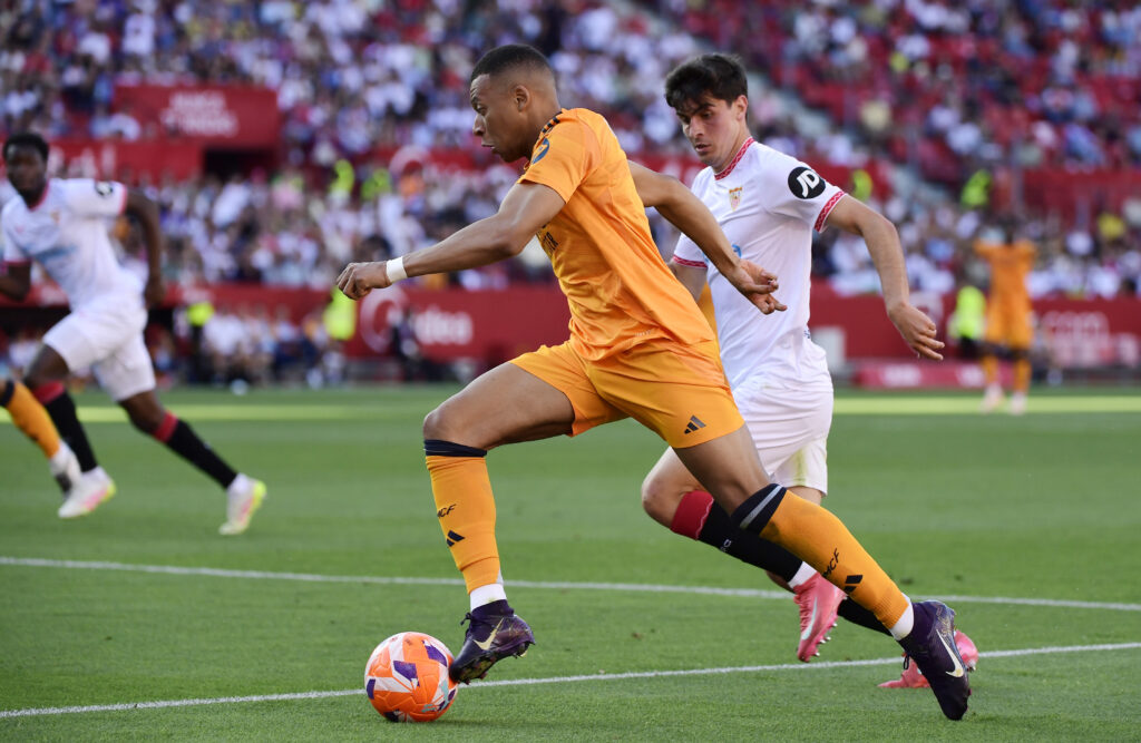 A nouveau porté par Kylian Mbappé, le Real Madrid est allé s’imposer (2-0) sur la pelouse du Séville FC dimanche lors de la 37e journée de Liga, tandis que Villarreal a gâché la fête du FC Barcelone (3-2), déjà sacré champion d’Espagne jeudi.Auteur de son 29e but en championnat, le 41e toutes compétitions confondues, l’attaquant français a permis au club madrilène, à onze contre neuf pendant 45 minutes après deux cartons rouges sévillans, d’ouvrir le score (75e, 1-0) avant que l’Anglais Jude Bellingham ne double la mise en fin de match (87e, 2-0).Cette nouvelle réalisation, la septième sur les cinq dernières journées, conforte son statut de “Pichichi”, le meilleur buteur de Liga, avec quatre longueurs d’avance sur le Polonais du FC Barcelone Robert Lewandowski, resté muet dans la défaite sans conséquence contre Villarreal (3-2).Elle rapproche aussi Mbappé du Soulier d’Or européen, à une longueur d’égaler le total du Suédois du Sporting Portugal Viktok Gyokeres.Officiellement sacré champion pour la 28e fois de son histoire jeudi, le Barça, qui avait commencé à célébrer son triplé national (Liga, Coupe du Roi, Supercoupe d’Espagne) vendredi dans les rues de la capitale catalane, a lui vu la seconde partie de sa fête un peu gâchée par Villarreal (5e), venu chercher sur la pelouse du stade olympique de Montjuic sa qualification pour la Ligue des champions (3-2).- L’Atlético Madrid prive le Betis de C1 -Les hommes de Marcelino, l’ex-entraîneur de l’Olympique de Marseille, ne peuvent plus être rattrapés par le Betis Séville (6e), corrigé (4-1) au Metropolitano par l’Atlético Madrid (3e) et qui voit ses rêves de C1 s’envoler.L’équipe d’Antoine Griezmann, distancée dans la course au titre depuis plusieurs semaines, est elle aussi assurée de retrouver la Ligue des champions, tout comme l’Athletic Bilbao (4e), vainqueur à Valence (1-0).La course aux deux autres compétitions européennes reste encore ouverte, avec trois équipes qui se tiennent en un point pour se qualifier en Ligue Europa et en Ligue conférence: le Celta Vigo (7e), le Rayo Vallecano (8e) et Osasuna (9e).Dans le bas du classement, Leganés (18e) a remporté trois points précieux dans sa mission pour le maintien en battant (1-0) Las Palmas (19e), déjà relégué, comme Valladolid (20e).Getafe (13e), Alavés (14e), Gérone (15e) et le Séville FC (16e) sont tous sauvés, mais pas l’Espanyol Barcelone (17e), encore en danger lors de la dernière journée, face à Las Palmas.