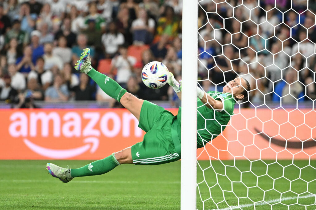 A l’image de son équipe, elle sait souffrir sans plier: la gardienne allemande Ann-Katrin Berger, décisive pour éliminer la France, se dressera face à l’armada offensive espagnole mercredi à Zurich en demi-finale de l’Euro de football.A 34 ans, appelée sur le tard en sélection avec seulement 26 capes, Berger possède “la qualité et l’ambition nécessaires pour mener l’équipe à un grand exploit”, l’adoubait lundi la légende Lothar Matthäus, capitaine de la Mannschaft championne du monde en 1990.En poules pourtant, le tempérament joueur de la portière inquiétait son sélectionneur Christian Wück. Sans la ménager, il avait confié à la presse qu’il ne “ferait pas de vieux os” si la gardienne – qui a commencé comme joueuse de champ quand elle était jeune – continuait à dribbler dans sa surface.”Cela peut paraître risqué, mais j’étais confiante”, avait posément répondu la gardienne, “pas vraiment émotive” de nature et qui a puisé dans un double cancer de la thyroïde, vaincu en 2017 et 2022, des raisons supplémentaires de relativiser.”J’ai vraiment dû apprendre à ne pas prendre ma santé comme un acquis”, avait confié dernièrement à l’UEFA Ann-Katrin Berger, qui a connu sa première sélection à 27 ans en 2020.Quand le tournoi a basculé dans la phase couperet, face à une équipe de France jusque-là impériale, Berger a ressorti sa cape d’héroïne: dernier rempart des Allemandes réduites à dix et menées dès la 15e minute, elle a multiplié les parades avant d’écarter deux tirs au but (1-1, tab 6-5), grâce en partie à une antisèche sur sa gourde qui détaillait les préférences des tirs adverses.”Elle est si calme, si intelligente. Je savais qu’elle arrêterait les penalties”, a raconté la milieu Sjoeke Nüsken, autrice de l’égalisation allemande, pendant que l’ailière Klara Bühl la décrivait en “pilier de sérénité de l’équipe”, auréolée de son “expérience de vie extraordinaire”.- “Moment de génie” -La N.1 allemande s’est même offert à la 103e minute le sauvetage le plus spectaculaire de l’Euro, plongeant son 1,80 m vers l’arrière pour claquer de la main gauche une déviation de la tête de sa capitaine Janina Minge sur un tir de Sakina Karchaoui.”Il n’existe pas de meilleur arrêt de tous les temps (…), mais Berger appartient désormais à cette conversation”, juge The Athletic, pour qui ce “moment de génie” condense tout l’art d’un gardien, du temps de réaction à la puissance physique en passant par “la coordination oeil-main”.Elue meilleure joueuse du quart de finale, les observateurs de l’UEFA ont estimé qu’elle avait “fait preuve d’un grand sang-froid pendant le match notamment avec son grand arrêt en prolongation”.”Il faut aussi rendre hommage à leur gardienne, elle a fait un match exceptionnel”, avait concédé aussi la portière française Pauline Peyraud-Magnin.A l’heure de défier mercredi (21h00) à Zurich les championnes du monde espagnoles, et leurs 16 buts empilés en quatre rencontres, la gardienne du FC Gotham new-yorkais sera d’autant plus précieuse qu’elle avait offert aux siennes le bronze olympique l’an dernier en battant la Roja (1-0).Après avoir disputé les six matches des JO et arrêté deux tirs au but et en avoir marqué un en quart face au Canada (0-0, tab 4-2), Berger avait sorti à la dernière minute de la petite finale un penalty de la double Ballon d’or Alexia Putellas – qui vient d’en manquer un en quart de l’Euro contre la Suisse (2-0).La joueuse originaire de la ville de Göppingen, passée par le PSG et Birmingham avant de remporter cinq championnats d’Angleterre avec Chelsea (2019-2024), a des rendez-vous tout personnels avec la finale dimanche à Bâle, face au vainqueur d’Angleterre-Italie.”Mon grand-père a eu 92 ans il y a quelques jours. Ma motivation est qu’il vienne à la finale. Il a dit que les quarts de finale et les demi-finales ne valent pas le coup”, racontait-elle mi-juillet. “J’ai essayé de le convaincre, mais c’est un dur à cuire”. Elle pourrait aussi être opposée à sa compagne, l’Anglaise Jess Carter, si les deux se hissent en finale à Bâle.