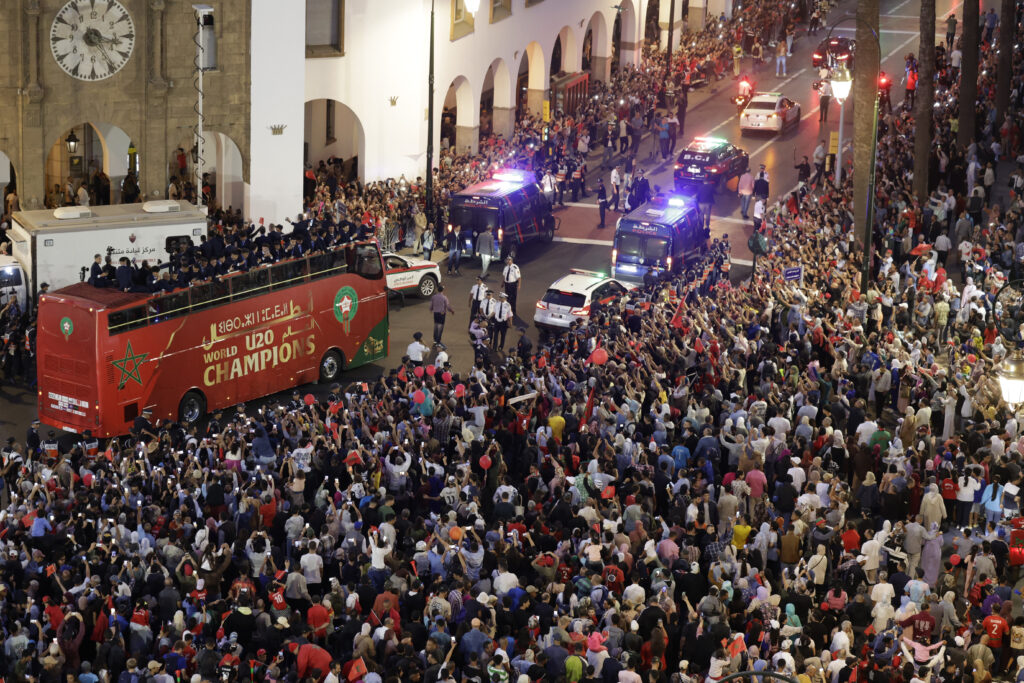 Plusieurs milliers de personnes se sont rassemblées mercredi à Rabat pour célébrer la victoire de l’équipe marocaine au Mondial des moins de 20 ans, saluant le passage du bus des Lionceaux de l’Atlas, entouré de familles en liesse au son des vuvuzelas.Tout au long du cortège qui traversait la ville, une foule compacte de supporters vêtus de rouge et vert ont agité des drapeaux marocains, tandis que les plus audacieux grimpaient sur les toits pour apercevoir les joueurs qui paradaient sur un bus à impériale.Avant la parade, le prince héritier du Maroc, Moulay El Hassan, a présidé au palais royal une cérémonie en l’honneur des membres de l’équipe.”C’est un exploit, ils nous ont remplis de joie et ont brandi le drapeau de notre pays très haut”, s’est enthousiasmé auprès de l’AFP Youssef, un commercial de 34 ans.Depuis son balcon, Claire Gallouin, une étudiante française de 19 ans, filmait la scène. “Je n’avais jamais vu autant de monde à Rabat, a-t-elle dit. J’ai compris à quel point les Marocains aiment le foot”.Au Chili, les jeunes Marocains se sont imposés dans la nuit de dimanche à lundi 2-0 face aux favoris argentins à Santiago, portés par un doublé de Yassir Zabiri (12e, 29e). Une victoire historique pour le football marocain et arabe.”L’avenir de notre football est entre de bonnes mains. Bravo les gars, champions du monde U20!”, avait salué lundi sur X Achraf Hakimi, le défenseur du Paris SG et de la sélection marocaine demi-finaliste du Mondial 2022 au Qatar.Le Marcoc accueille la Coupe d’Afrique des nations de football à la fin de l’année et co-organisera le Mondial-2030 avec l’Espagne et le Portugal.