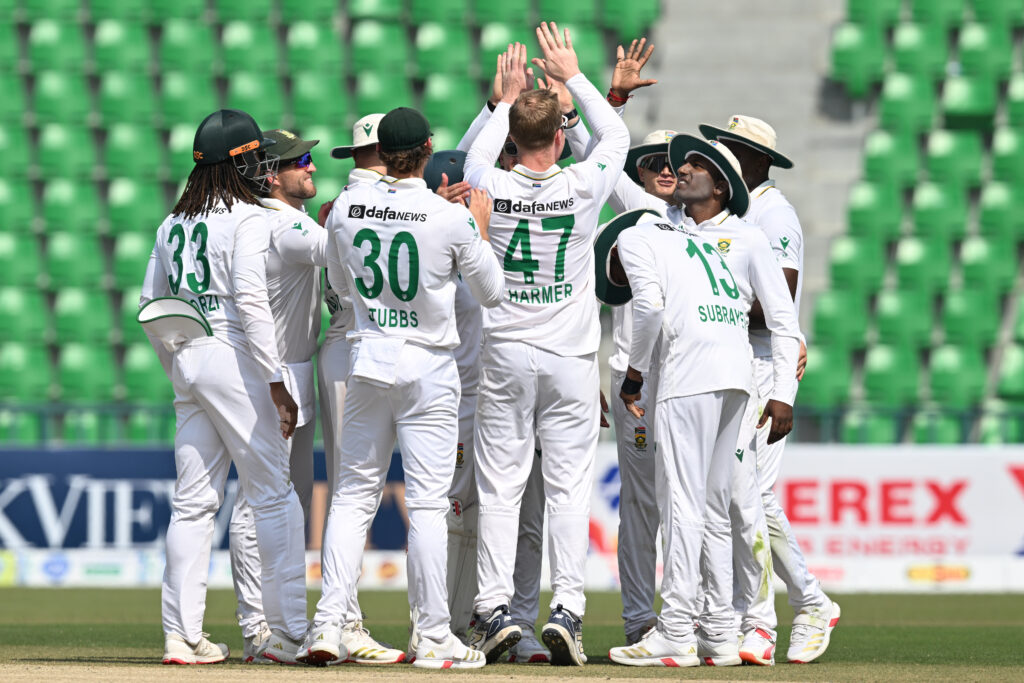 South Africa spinner Simon Harmer took two wickets as Pakistan reached 36-2 at lunch Tuesday in their second innings of the first Test in Lahore, extending their lead to 145.Earlier, South Africa had been dismissed for 269 an hour before lunch, having resumed on 216-6 on day three. Pakistan spinner Noman Ali took 6-112 for his ninth haul of five wickets or more in Tests.It gave Pakistan a 109-run lead after they scored 378 in the first innings, but left their openers with a tricky 11 overs to negotiate against the new ball before the break. The 36-year-old Harmer had Imam-ul-Haq stumped by wicketkeeper Kyle Verreynne for nought in his first over before trapping Shan Masood lbw for seven.Abdullah Shafique, 21 not out, and Babar Azam, on one, were the not out batsmen at lunch.South Africa’s Tony De Zorzi resumed on 81 at the start of the day and carried the fight to Pakistan on a turning Gaddafi Stadium pitch as he completed his second Test century with a six and two singles off Noman. The left-hander finally holed out for 104 to long-on off Noman, where Shaheen Shah Afridi took a low catch, ending a 208-minute innings containing 10 fours and two sixes.Noman, who bowled a probing 35 overs, also removed Prenelan Subrayen for four during the session.Fellow spinner Sajid Khan took the first wicket of the day when he had Senuran Muthusamy caught by Salman Agha for 11. He then wrapped up the innings when he bowled Kagiso Rabada for nought to finish with 3-98 off 33 overs.
