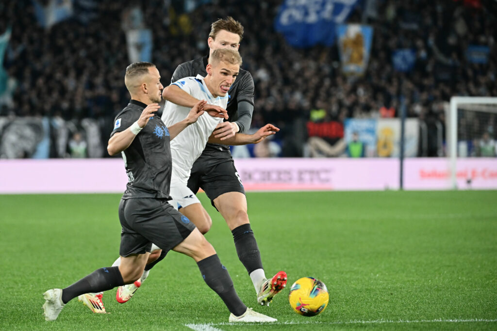 Naples, leader de Serie A, a enchaîné un troisième match nul consécutif en concédant le 2-2 sur la pelouse de la Lazio, lors de la 25e journée de championnat.Le Napoli (56 points) peut perdre la tête dimanche soir en cas de victoire de l’Inter Milan, qui est pour le moment à deux points, contre la Juventus. La Lazio (4e, 46 points) reste elle sous la menace des Turinois (43 points).La rencontre a démarré très fort au Stadio Olimpico avec deux buts dans le premier quart d’heure. Il n’a fallu que six minutes à la Lazio pour ouvrir le score grâce à une frappe exceptionnelle aux trente mètres de Gustav Isaksen, dans la lucarne, après une mauvaise relance d’Amir Rahmani de la tête directement sur lui.Auteur de trois buts en championnat cette saison, l’attaquant danois n’avait plus marqué depuis le match aller (1-0) le 8 décembre à Naples.Les Napolitains n’ont pas douté longtemps et ont égalisé sept minutes plus tard par Giacomo Raspadori, qui a trompé Ivan Provedel entre les jambes après un une-deux avec Romelu Lukaku, pour leur première titularisation ensemble en attaque cette saison.Peu avant l’heure de jeu, ils ont même pris l’avantage, avec beaucoup de réussite, grâce à un but contre-son-camp d’Adam Marusic. Le ballon de la frappe de Raspadori a rebondi sur Gila, au sol, avant de revenir dans les pieds de Marusic qui a poussé la balle malgré lui au fond de ses filets.Après un but de Zaccagni annulé pour hors-jeu, la Lazio a arraché le match nul à la 87e minute grâce à Boulaye Dia, entré en jeu une grosse dizaine de minutes plus tôt. Elle avait perdu sur blessure son attaquant Valentin Castellanos au bout de trente minutes.Dans la soirée l’AC Milan a gagné une place au classement (7e) en battant difficilement Vérone (1-0) grâce à un but de Santiago Gimenez à un quart d’heure de la fin.