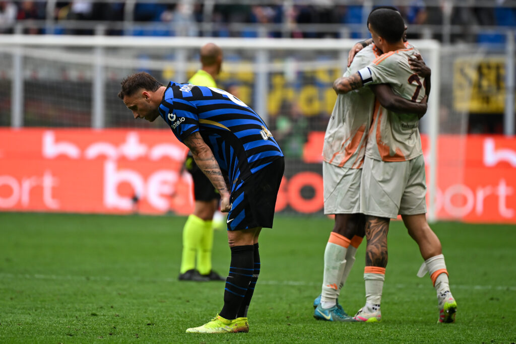 Rien ne va plus pour l’Inter Milan qui a concédé dimanche à domicile contre l’AS Rome (1-0) une troisième défaite consécutive qui peut permettre à Naples de passer seul en tête du Championnat d’Italie.L’Inter est au bout du rouleau avant de défier le FC Barcelone mercredi en demi-finale aller de la Ligue des champions.Battus à Bologne (1-0) le week-end dernier en Serie A, humiliés par l’AC Milan en demi-finale de la Coupe d’Italie (3-0) mercredi, les Nerazzurri ont peut-être perdu tout espoir de conserver leur titre de champion en l’espace de huit jours. Toujours privés de Marcus Thuram, touché à une cuisse depuis dix jours, ils ont été mis KO par un but de Matias Soulé à la 22e minute.Mais l’absence de Thuram et l’inefficacité de ses doublures, Marko Arnautovic ce dimanche, n’expliquent pas tous les maux actuels de l’Inter. Sa défense a souffert pendant 90 minutes notamment face à la rapidité de Soulé et a concédé au moins un but sur ces neuf derniers matches, une série inédite depuis que Simone Inzaghi entraîne l’Inter. Autre mauvaise nouvelle pour le technicien italien, son latéral droit Benjamin Pavard s’est blessé à la cheville gauche et est incertain pour le choc contre le Barça.”Trois défaites en une semaine, cela fait mal, nous ne sommes pas habitués à une telle série. C’était un match très important, mais on a manqué de lucidité. Il faut tenter de retrouver de l’énergie, on ira à Barcelone avec beaucoup de respect pour cette équipe, mais sans peur”, a analysé Inzaghi.- Kolo Muani marque -Si ce dimanche en début de soirée (20h45), le Napoli (71 points comme l’Inter) dispose à domicile du Torino (10e), il sera le nouveau leader de la Serie A, avec trois points d’avance à quatre journées du terme de la saison.De son côté, l’AS Rome a réalisé une bonne opération en vue d’une qualification européenne. Après ce 18e match consécutif sans défaite en championnat (13 victoires, cinq nuls), l’équipe entraînée depuis novembre par Claudio Ranieri est passée briévement de la 7e à la 5e place (60 pts), avant de redescendre au 6e rang à la suite de la victoire de la Juventus Turin face à la lanterne rouge Monza (2-0) qui file vers la Serie B.La Juve, réduite à dix juste avant la pause après l’exclusion de Kenan Yildiz pour avoir donné un coup de coude à un adversaire, s’est imposée grâce à Nico Gonzalez (11e) et Randal Kolo Muani (33e) pour son premier but depuis deux mois et demi.Les Bianconeri, qui restaient sur une défaite à Parme (1-0), se sont emparés provisoirement de la très convoitée 4e place (62 pts), la dernière qualificative pour la C1.Mais pas moins de quatre équipes ont la même ambition: seuls trois points séparent le 4e du 8e, la Fiorentina, victorieuse d’Empoli (2-1).Le programme de cette 34e journée a été remaniée après la mort du pape François dont les funérailles ont eu lieu samedi à Rome. Les trois matches prévus samedi, dont celui de l’Inter, ont été reprogrammés dimanche.
