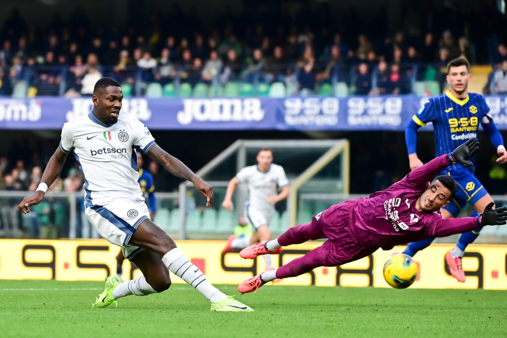 L’Inter Milan a pris provisoirement les commandes du Championnat d’Italie grâce à un doublé et une passe décisive de Marcus Thuram sur le terrain de Vérone, surclassée 5 à 0 en ouverture de la 13e journée, samedi.Malgré les absences de son capitaine Lautaro Martinez, malade, et de son meneur Hakan Calhanoglu, ménagé, l’Inter a donné une leçon à l’Hellas qui avait déjà encaissé trois buts après seulement 25 minutes de jeu.Resté muet avec l’équipe de France face à Israël et l’Italie en Ligue des nations, Thuram a été le grand artisan de cette huitième victoire en Serie A des champions d’Italie en titre.”Des fois je marque deux buts, des fois j’en marque trois, des fois aucun, mais comme je le dis toujours, le plus important est d’aider l’équipe”, a déclaré Thuram sur la plateforme DAZN.L’avant-centre a d’abord idéalement lancé Joaquin Correa, titularisé en l’absence de Martinez, qui a inscrit, en lobant le gardien de Vérone Lorenzo Montipo, son premier but en championnat depuis plus de deux ans (17e).L’attaquant argentin, prêté la saison dernière à Marseille, avait fini l’exercice 2023-24 sans marquer un seul but.Thuram a doublé la mise quatre minutes plus tard en profitant d’une erreur de marquage de Vérone pour dribbler Montipo et inscrire son premier but en championnat depuis son triplé contre le Torino le 5 octobre.Son second but de l’après-midi, son neuvième de la saison en championnat, ressemble au premier: parti à la limite du hors-jeu, il a porté le score à 3-0 en prenant le meilleur sur Montipo.Le gardien de Vérone est allé chercher le ballon dans ses filets à deux reprises supplémentaires avant la pause, sur une frappe de Stefan de Vrij (31e) et une combinaison conclue par Yann Bisseck (41e).L’Inter totalise désormais 28 points, soit deux de plus que Naples (2e) qui reçoit dimanche l’AS Rome.Mais avec six équipes se tenant en deux points en haut de tableau avant le coup d’envoi de cette 13ème journée, les Nerazzurri peuvent finir le week-end hors du podium.”On a fait un match sérieux, avec seulement 48 heures pour le préparer avec un effectif au complet”, a analysé Simone Inzaghi.”Marcus avait déjà réalisé une belle saison l’an dernier, il prend encore plus ses responsabilités cette saison, mais il peut encore mieux faire”, a ajouté son entraîneur.