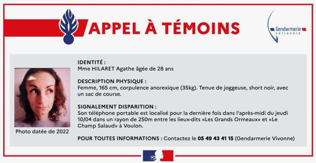 Une vaste zone forestière de 100 km2 que les enquêteurs “ratissent”: d’importantes recherches pour retrouver une joggeuse de 28 ans disparue depuis jeudi ont repris samedi matin dans la Vienne, après un appel à témoins pour disparition inquiétante.Agathe Hilairet, coureuse expérimentée de frêle corpulence (1,65 m, 35 kg) qui pratique le trail, s’était élancée jeudi matin du domicile de ses parents à Vivonne. Son père a donné l’alerte en ne la voyant pas revenir, tandis que son téléphone ne répondait plus.Un important dispositif de recherches a été déployé jeudi après-midi, puis à nouveau vendredi sur une vaste zone incluant les communes de Vivonne, Voulon, Celle-Lévescault et Gençay.”La personne disparue n’a pas été retrouvée à cette heure. Les recherches continuent ce (samedi) matin”, a déclaré samedi Cyril Lacombe, procureur de la République à Poitiers, ajoutant qu’il communiquerait des éléments sur les investigations “en début d’après-midi”.”On a une centaine de gendarmes, accompagnés de 25 militaires, qui ratissent à nouveau”, a précisé à l’AFP une source proche de l’enquête.Le dispositif inclut également un hélicoptère avec caméra thermique, des plongeurs d’une brigade nautique, quatre dronistes, ainsi que des sapeurs-pompiers, des employés de l’Office français de la biodiversité (OFB), des bénévoles de la Protection civile ou encore des membres du club sportif où est inscrite la jeune femme.- “Difficile d’accès” -“On a défini une zone d’intérêt de 100 km2 au sud de Vivonne, une zone particulièrement difficile d’accès puisque c’est une zone forestière, avec énormément de sentiers. Donc j’ai des moyens tout-terrain”, a déclaré à la presse le colonel Philippe-Alexandre Assou du groupement de gendarmerie de la Vienne.Il a souligné que la participation des membres du club de joggeurs auquel appartient la jeune femme, qui “ont l’habitude du terrain” et des sentiers qu’elle empruntait habituellement, apporte une “plus-value énorme” aux enquêteurs. Des plongeurs sondent aussi la rivière Clain qui traverse la zone.Dans le cadre d’une enquête ouverte pour “disparition inquiétante”, le parquet de Poitiers avait diffusé vendredi un appel à témoins pour retrouver cette joggeuse, présentant une “taille très mince”, vêtue d’une tenue de jogging avec un short noir et un haut manches courtes de couleur sombre, et porteuse d’un sac de course. Elle avait les cheveux attachés et son téléphone accroché à son poignet.L’appareil a été localisé pour la dernière fois dans l’après-midi de jeudi dans un rayon de 250 mètres entre les lieux-dits “Les Grands Ormeaux” et “Le Champ Salaud” à Voulon, commune située à 10 km de Vivonne.- “Choc” -Sur l’application de géolocalisation sportive Strava, où elle partageait le résumé de ses sorties pouvant dépasser les 20 km parcourus, la jeune femme se décrit comme “adorant la course à pied”, qu’elle pratique “depuis (ses) 17 ans”.Après “plusieurs années d’arrêt”, elle disait avoir repris la course à pied en mai dans un message posté sur son compte Facebook.Pour Rose-Marie Bertaud, maire de Vivonne, les habitants de cette petite ville de 4.500 habitants sont dans “l’attente”.”C’est un choc pour la population, nous sommes une commune tranquille où il fait bon vivre”, a-t-elle déclaré à la presse. “Pour nous, c’est triste, d’autant plus que plus le temps passe, plus ça devient difficile de savoir ce qui a pu arriver à cette jeune fille.”Une vingtaine de témoignages ont commencé à affluer à la suite de la diffusion de l’appel à témoins, a précisé M. Assou. Les gendarmes de la brigade de recherche de Poitiers, épaulés par la section de recherche de Poitiers, s’attachent à les vérifier.”Toutes les pistes pour retrouver cette jeune femme sont explorées”, avait souligné vendredi le procureur Cyril Lacombe.