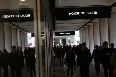 LONDON (Reuters) -Major British retailer Frasers said it felt “kicked in the face” by the government’s tax hiking budget, blaming it for a drop in consumer confidence that forced a cut to annual profit guidance.