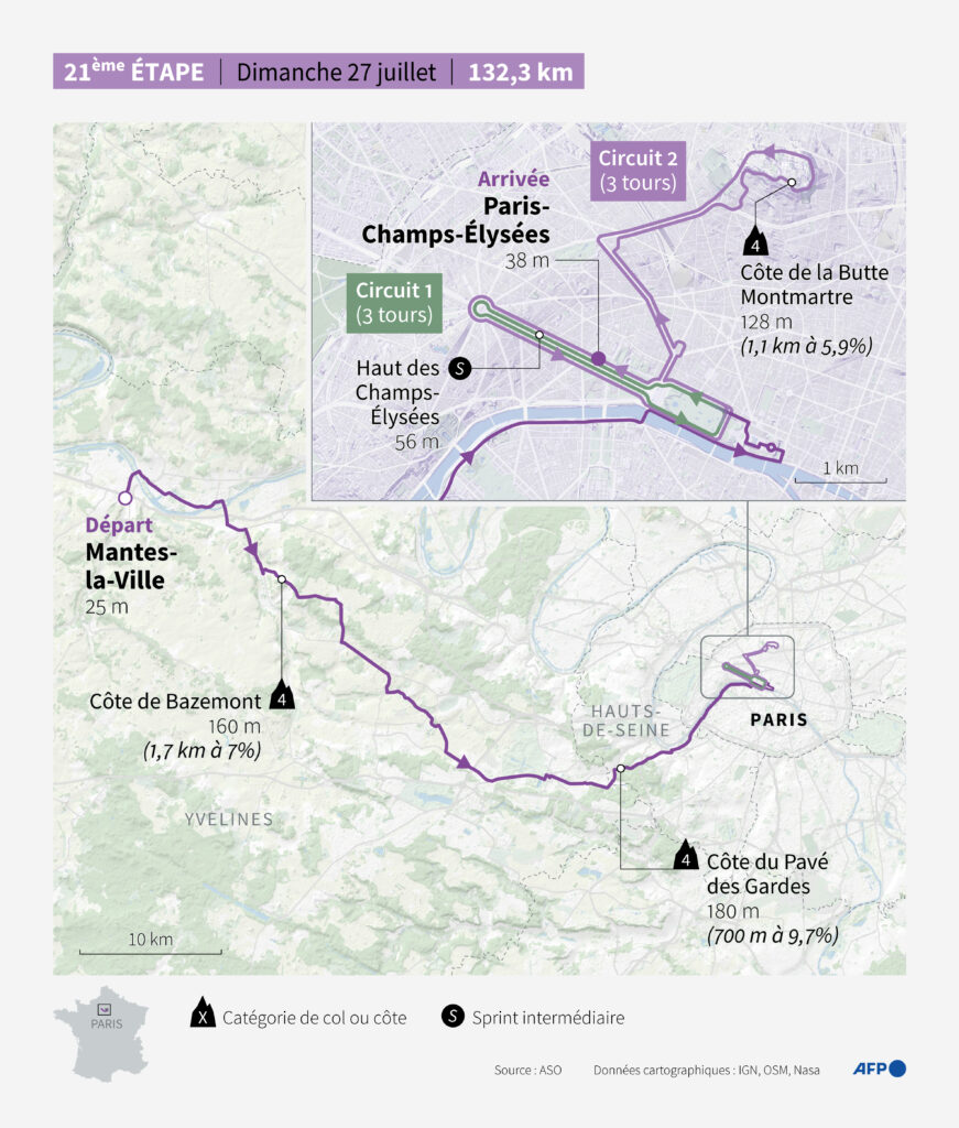 Un an après la fièvre des JO, l’inclusion inédite sur le Tour de France de la butte Montmartre vient épicer la 21e et dernière étape qui s’annonce spectaculaire dimanche soir à Paris même si la plupart des coureurs se seraient bien privés de ce “stress inutile”.Les pavés de la rue Lepic, le Moulin Rouge, le French Cancan, le Sacré-Coeur… comment ne pas s’enthousiasmer devant le retour à l’affiche de ces lieux emblématiques où le monde avait assisté l’an dernier à l’un des grands temps forts des Jeux Olympiques ?De son propre aveu “jaloux” par le spectacle total offert ce jour-là devant 500.000 spectateurs déchaînés, le directeur du Tour de France, Christian Prudhomme, s’était mis à rêver le soir-même à dupliquer l’événement.Et après bien des péripéties, un premier véto de la Préfecture de police et le coup de pouce décisif du président Emmanuel Macron, “l’impossible est devenu possible”.Le peloton du Tour de France passera donc pour la première fois de son histoire par Montmartre avant de finir comme d’habitude sur les Champs-Élysées, son terminus depuis cinquante ans.A défaut de suspense pour le classement général où Tadej Pogacar, nanti d’une avance de plus de quatre minutes, peut avancer sereinement vers un quatrième victoire dans le Tour, Paris s’apprête à plonger dans la nostalgie avec cette nouvelle Madeleine de Proust sur le parcours mémoriel des JO.- “Mal à mon coeur de sprinteur” -Mais l’affaire change aussi complètement la physionomie sportive de cette dernière étape qui était devenue un aimable défilé où les coureurs trinquaient au champagne avant que les sprinteurs ne s’affolent lors des huit tours des Champs-Élysées.Cette fois, les coureurs ne feront que trois tours classiques avant de parcourir trois fois une boucle de 16,8 km comprenant la butte Montmartre dont l’ascension (1,1 km à 5,9 %) est suffisamment difficile pour potentiellement éliminer tous les sprinteurs.Au troisième passage au sommet de la Butte, il restera six kilomètres jusqu’à l’arrivée, ce qui va forcément favoriser les attaques des puncheurs et sans doute empêcher un sprint massif.Dès que le parcours est sorti, la levée de boucliers a été générale chez les bolides du peloton face au risque d’être privés du final le plus prestigieux de l’année pour eux.”J’ai mal à mon coeur de sprinteur”, compatit l’ancienne sprinteur allemand Marcel Kittel devant cette rupture de la tradition, qui plus est pour le 50e anniversaire de la première arrivée sur les Champs.Les coureurs de classement général aussi sont vent debout. Remco Evenepoel, pourtant champion olympique sur ce parcours, a été le premier à s’en émouvoir, dénonçant, avant son abandon, un “stress supplémentaire inutile”.- “Personne n’aime” -“Montmartre, ça a été très sympa pendant les JO mais il ne restait plus que 50 coureurs dans le peloton. Sur le Tour de France, on sera 150 à lutter pour se positionner sur une montée très étroite”, a embrayé Jonas Vingegaard.Seul Pogacar s’est voulu philosophe, n’y voyant “pas trop de différence pour lui personnellement”.”C’est clair que ça va mettre un peu de stress”, concède l’architecte du parcours Thierry Gouvenou, auprès de l’AFP, avant de relativiser.”Aux JO les coureurs zigzaguaient dans des ruelles en descente alors que là on va prendre des artères beaucoup plus larges. La montée de la rue Lepic est étroite, bien sûr. Mais quand on fait un secteur pavé sur Paris-Roubaix, ce n’est pas plus large.”Matteo Jorgenson, le lieutenant de Vingegaard, regrette aussi que les coureurs, pour la plupart morts de fatigue, n’aient plus le loisir de savourer une dernière étape tranquille et fêter leur arrivée à Paris après trois semaines particulièrement éreintantes, avec en plus des transferts interminables.”On a suffisamment souffert comme ça. Chez les coureurs, personne n’aime cette dernière étape”, assure l’Américain.Départ à Mantes-la-Ville à 16h10 (réel à 16h25), arrivée sur les Champs-Élysées à 19h35 (horaire calculé sur une moyenne de 41 km/h)