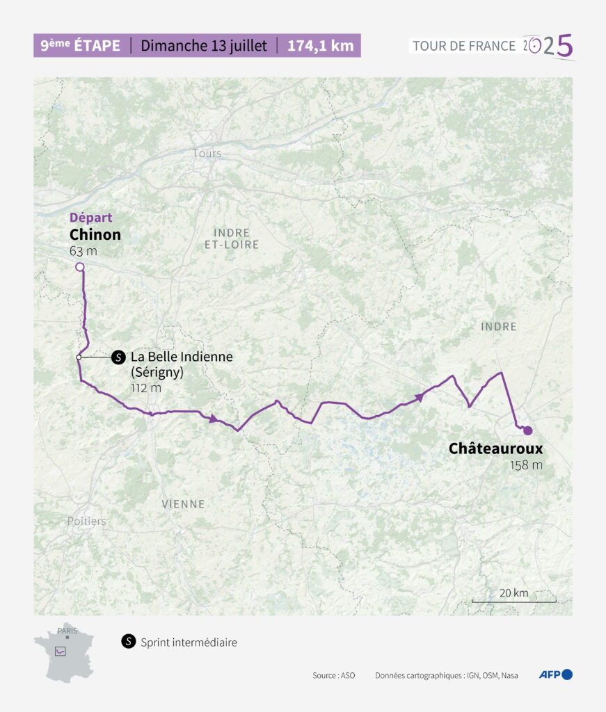 La neuvième étape du Tour de France dimanche est encore promise aux sprinteurs, entre Chinon et Châteauroux, rebaptisée “Cavendish City”, du nom du bolide britannique qui s’est imposé à trois reprises dans la ville préfecture de l’Indre.La chaleur devrait une nouvelle fois être au rendez-vous puisqu’on attend plus de 30°C à l’ombre, avec possiblement des orages à l’arrivée de cette étape plate de 171 km.Le vent pourrait jouer un rôle dans le final qui offre plusieurs changements de direction. “Mais je ne crois pas que les équipes de sprinteurs vont louper ce rendez-vous qui est important pour elles”, souligne Thierry Gouvenou, le traceur du Tour de France auprès de l’AFP.Ce sera la cinquième fois qu’une étape de la Grande Boucle arrive à Châteauroux et les quatre premières n’ont pas échappé aux “grosses cuisses”. En 1998, l’Italien Mario Cipollini a ouvert le bal avant que Mark Cavendish n’entre en action pour trois succès en 2008, 2011 et 2021.Désormais retraité, le détenteur du record de victoires au Tour de France (35) est devenu l’un des plus grands ambassadeurs de la ville.Fin juin, le maire Gil Avérous lui a rendu hommage en postant sur les réseaux sociaux une photo d’un panneau de la commune où l’écriteau “Cavendish City” a été ajouté en-dessous.Ce sera l’une des dernières occasions de s’illustrer pour les sprinteurs, qui vont souffrir lors de la suite de ce Tour de France avec les trois massifs au programme (Massif central, Pyrénées et Alpes).Pour les favoris, la journée devrait être l’occasion de prendre encore des forces avant la première étape de montagne, lundi 14 juillet, entre Ennezat et Le Mont-Dore Puy de Sancy.Départ de Chinon à 13h10 (réel à 13h25), arrivée à Châteauroux à 17h17 (horaire calculé sur une moyenne de 45 km/h)