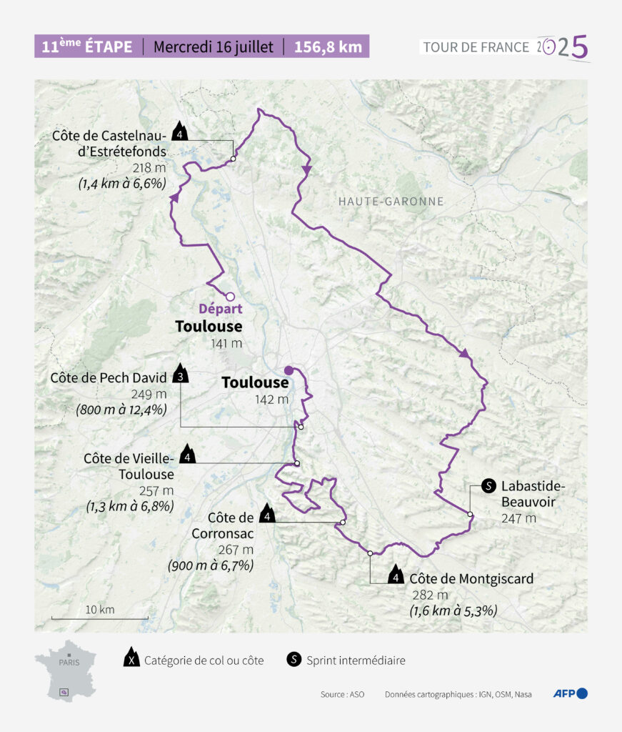 La onzième étape du Tour de France propose mercredi une boucle de 156 km autour de Toulouse où les sprinteurs ont souvent été à la fête mais devraient souffrir cette fois sur un terrain rendu volontairement exigeant.Au lendemain de la journée de repos, le peloton remet en route en empruntant les coteaux du sud de Toulouse avec une succession de bosses propres, selon la philosophie des organisateurs d’ASO, à épicer les débats.”Toulouse fait partie des étapes qu’on a retravaillées après le dernier Tour de France. Traditionnellement, Toulouse, c’est une arrivée au sprint. Mais là, vu le côté monotone des étapes de sprinteurs, on a décidé de modifier le parcours”, explique Thierry Gouvenou, l’architecte du parcours, à l’AFP.Dans les cinquante derniers kilomètres, la route devient ainsi “extrêmement casse-pattes avec d’abord trois côtes de quatrième catégorie avant ce fameux mur à huit kilomètres de l’arrivée, la côte de Pech David, qui fait 12,5% de moyenne sur 800 mètres avec quasiment 20% au pied”.Ce raidard pourrait bien éliminer une bonne partie des sprinteurs. “Il va vraiment falloir de bonnes jambes pour passer ce talus. Au sommet, il y a une descente technique, suivie de cinq kilomètres de plat. Ce sera très difficile de se replacer si on a perdu des places dans Pech David”, insiste Gouvenou.Pendant toute la première semaine du Tour déjà, le responsable du parcours s’était efforcé à placer la moindre côte sur le tracé pour tromper l’ennui des étapes de plaine.Cette volonté était déjà présente il y a un siècle lorsque Henri Desgrange, l’organisateur du premier Tour en 1903, s’était tellement ennuyé devant une étape remportée en 1909 par Jean Alavoine à Toulouse qu’il avait décidé d’éviter la ville rose pendant trente ans et de mettre les Pyrénées au menu dès l’année suivante.L’édition 1910 fut ainsi marquée par une étape entrée dans la légende de 326 km (et… 7.000 m de dénivelé) entre Luchon et Bayonne avec les ascensions des cols de Peyresourde, d’Aspin, du Tourmalet, d’Aubisque et d’Osquish, avec un départ à 3h30 du matin.”Vous êtes des assassins. Oui, des assassins!”, lança aux organisateurs le futur vainqueur d’étape et du Tour, Octave Lapize, après avoir été obligé de mettre pied à terre à plusieurs reprises.Départ de Toulouse à 13h15 (réel à 13h45), arrivée à Toulouse à 17h14 (horaire calculé sur une moyenne de 45 km/h)
