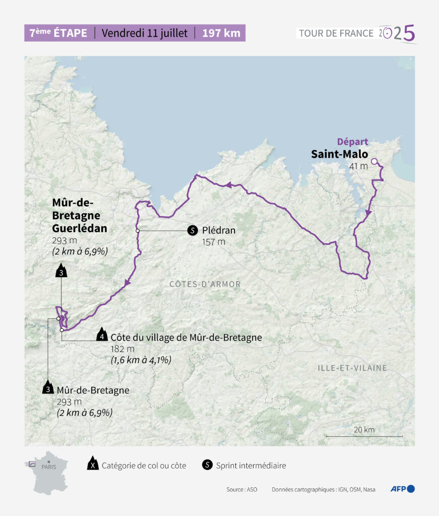 La septième étape du Tour de France vendredi au départ de Saint-Malo se terminera à Mûr-de-Bretagne, l’Alpe d’Huez breton qui s’est imposé depuis vingt ans comme l’un des classiques de la Grande Boucle.Longue de 197 km, avec 2.450 m de dénivelé positif, l’étape finira sur un circuit qui empruntera à deux reprises la fameuse côte, la première fois à quinze kilomètres du but, puis à l’arrivée.Ce sera la cinquième fois que le Tour se termine à Mûr-de-Bretagne après les victoires de Cadel Evans en 2011, Alexis Vuillermoz en 2015, Dan Martin en 2018 et Mathieu van der Poel en 2021.Il y a quatre ans, le Néerlandais avait déclenché un torrent d’émotions en signant sa première victoire sur le Tour pour endosser le maillot jaune que son grand-père, Raymond Poulidor, décédé quelques mois plus tôt, n’avait jamais porté.”Mûr-de-Bretagne devient quelque chose de traditionnel, explique le directeur course Thierry Gouvenou à l’AFP. On se rappelle des tactiques de Mathieu van der Poel la dernière fois. Il avait attaqué pour aller chercher des bonus. Cette année, il n’y a pas de bonus. Mais on peut avoir une super explication dans la montée finale. Les sprinteurs n’auront pas leur mot à dire.”En revanche, il est très possible que Tadej Pogacar ait, lui, envie de décrocher une nouvelle victoire dans cet effort pour purs puncheurs au terme d’une montée de 2 km à 6,9% de moyenne.En route, le peloton passera par Yffiniac, la ville natale de Bernard Hinault, l’occasion de rendre hommage au dernier vainqueur français de la Grande Boucle, en 1985.Départ à Saint-Malo à 12h10 (réel à 12h25), arrivée à Mûr de Bretagne à 16h51 (horaire calculé sur une moyenne de 44 km/h)
