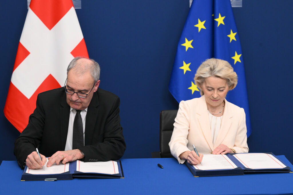 L’Union européenne et la Suisse ont signé lundi à Bruxelles une série d’accords, fruits de longues négociations, qui doivent leur permettre de renforcer leur coopération et de l’étendre à de nouveaux domaines.Pas moins de 18 textes ont été paraphés par le président de la confédération suisse Guy Parmelin et la présidente de la Commission européenne Ursula von der Leyen, après de longues négociations démarrées en 2014, mais qui avaient été interrompues en 2021 puis relancées il y a deux ans.”Ces accords constituent du point de vue du conseil fédéral un ensemble équilibré, pragmatique et mutuellement avantageux, moteur de prospérité, d’emploi et de stabilité.
