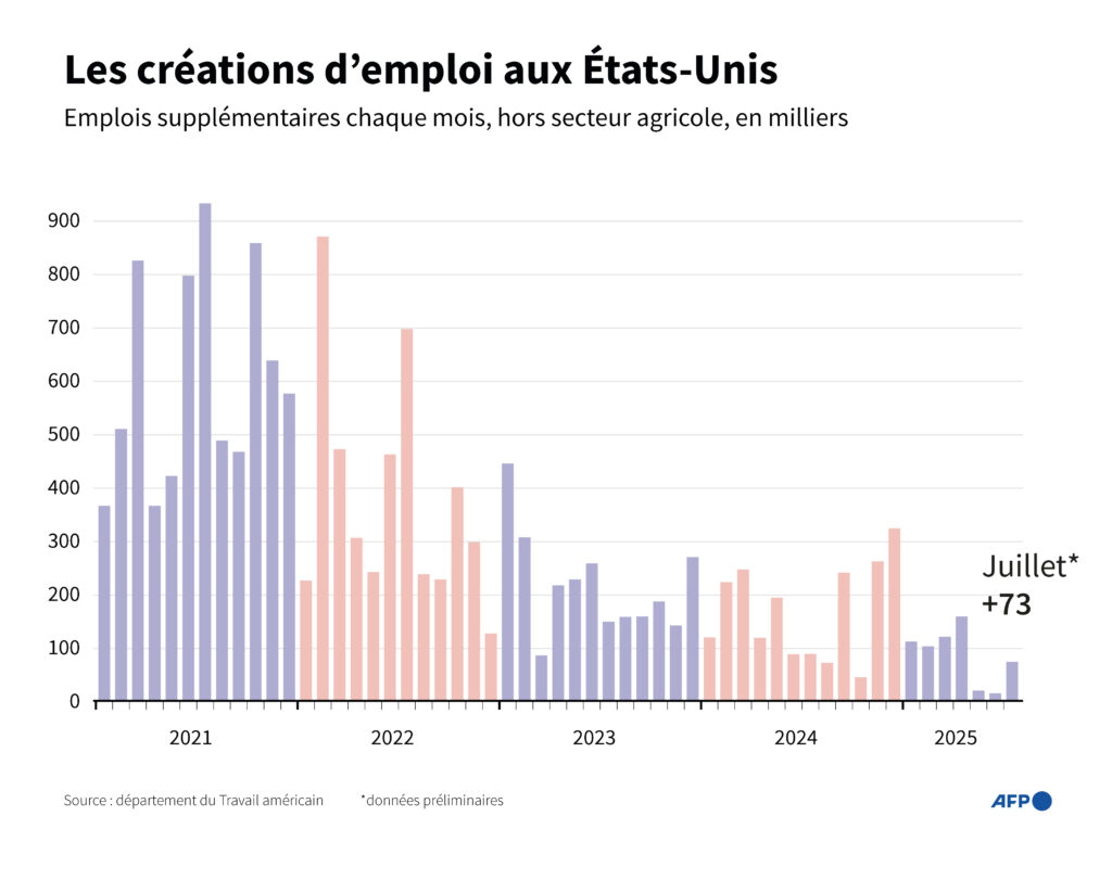 Le marché du travail s’est nettement affaibli ces derniers mois aux États-Unis, selon les données officielles publiées vendredi, affichant beaucoup moins de créations d’emplois qu’initialement estimé, un constat de nature à accentuer la pression sur la banque centrale.La première économie mondiale a créé 73.000 emplois en juillet, moins qu’attendu par les analystes, selon le rapport mensuel du ministère du Travail. Surtout, les créations d’emplois pendant les mois de mai et de juin ont été fortement révisées à la baisse. Les chiffres corrigés (19.000 en mai et 14.000 en juin) s’affichent ainsi au plus bas depuis la pandémie de Covid-19.Les corrections sont “bien supérieures à la normale”, est-il relevé dans le rapport. Ce sont 258.000 créations d’emplois qui se sont évaporées des statistiques sur ces deux mois.L’exécutif américain ne cesse d’affirmer que l’économie est rugissante, tout en appelant avec insistance la Réserve fédérale (Fed) à la soutenir davantage.Les créations d’emplois se sont concentrées dans un nombre réduit de secteurs (santé et services sociaux), alors que des emplois ont continué à être détruits au niveau de l’État fédéral, conformément au vœu du gouvernement républicain.L’appareil fédéral compte 84.000 emplois en moins depuis janvier, mois au cours duquel Donald Trump a été investi pour un second mandat.Le taux de chômage a légèrement progressé à 4,2%, contre 4,1% en juin. – Nouvelle donne -Les analystes s’attendaient à voir le marché du travail américain, jusqu’ici considéré comme proche du plein emploi, se craqueler sous l’effet du ralentissement économique induit par l’offensive protectionniste de Donald Trump.Ils ont été surpris par l’ampleur des changements, “comme un signal en provenance d’une planète très différente de celle qu’on connaissait hier”, selon les mots de Carl Weinberg, économiste à HFE.”C’est un rapport qui change la donne. Le marché du travail se détériore rapidement”, réagit dans une note l’économiste de la banque Navy Federal Credit Union, Heather Long.Au total, les États-Unis n’ont “créé en moyenne que 35.000 emplois au cours des trois derniers mois”, souligne-t-elle, ajoutant que la Réserve fédérale devait “sérieusement envisager une baisse des taux en septembre” pour soutenir l’économie.Les projections des investisseurs sur le niveau futur des taux directeurs de la banque centrale ont immédiatement changé. Ils sont davantage à miser sur une baisse des taux lors de la réunion de septembre, ce qui a fait baisser les taux d’emprunt de l’État fédéral et le dollar.Heather Long considère qu’il devient urgent de lever les incertitudes entourant l’offensive protectionniste du gouvernement: “Plus cette instabilité tarifaire durera, plus ce contexte de faible recrutement risque de se transformer en licenciements”, pressent-elle.- Attendre d’y voir plus clair -Mercredi, la Fed a laissé ses taux directeurs inchangés pour la cinquième fois d’affilée, son président Jerome Powell estimant qu’elle pouvait encore se permettre d’attendre d’y voir plus clair quant aux répercussions économiques des droits de douane. Deux des douze membres du comité de politique monétaire (FOMC) ont manifesté leur désaccord. Vendredi, avant l’ouverture de Wall Street et la publication des chiffres de l’emploi, ces gouverneurs dissidents ont publié des communiqués expliquant leur position. Ils estiment qu’il aurait fallu agir vite, en baissant les taux, plutôt qu’attendre d’assister à la dégradation de l’activité économique et des conditions d’emploi.Une baisse des taux aurait “protégé de manière préventive” l’économie et le marché du travail, argumente la gouverneure Michelle Bowman. Son collègue Christopher Waller a considéré de son côté que l’approche attentiste de la Fed était “excessivement prudente”.Le président Donald Trump, qui réclame inlassablement une diminution des taux directeurs, a traité vendredi matin sur son réseau social Truth Jerome Powell d'”ABRUTI têtu”.”S’IL CONTINUE à REFUSER” de baisser les taux, les autres responsables de la Fed “DOIVENT PRENDRE LE CONTRÔLE”, a-t-il écrit, comme souvent en majuscules.Selon Jamie Cox, du groupe Harris Financial, “Powell va regretter d’avoir laissé les taux inchangés cette semaine”. La Fed, ajoute-t-il, “devra baisser les taux en septembre et cela pourrait être d’un demi point d’un coup pour rattraper le temps perdu”.