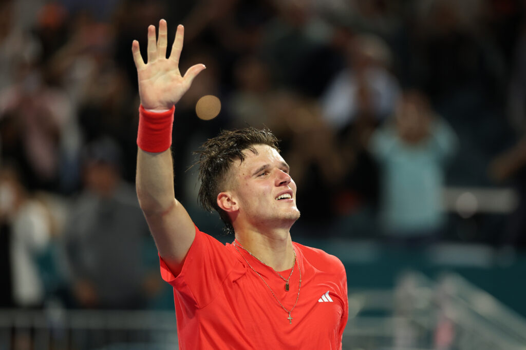 Czech teenager Jakub Mensik upset Novak Djokovic 7-6 (7/4), 7-6 (7/4) to win the Miami Open at Hard Rock Stadium on Sunday, denying the Serb his 100th career title.The 19-year-old, ranked 54th in the world, claimed his first title on the ATP Tour with an outstanding display of powerful tennis.The final was delayed by almost six hours due to heavy rain and when the players emerged it was clear that Djokovic had an eye infection. He used eye-drops during a changeover in the first set. Mensik started strongly, breaking Djokovic’s first serve game to go 2-0 up and the tall, big-serving Czech was dominating until, at 4-2 Djokovic broke back when Mensik found the net.The set remained on serve from then on, but in the tie-break Mensik’s powerful serve, with two aces, put him in charge from the outset. He opened up a 5-0 lead and although 24-time Grand Slam champion Djokovic fought back the youngster sealed the set with an overhead volley.It was the first set that Djokovic had lost in the entire tournament. Twice he lost his footing and ended up on his back, and he changed his footwear between sets.Mensik had beaten Djokovic by the exact same margin in the first set of their only other meeting in Shanghai before losing in three sets.This time, however, the momentum appeared to be with him.The second set was a nip and tuck affair, though, with neither player able to break. Once again Mensik’s power proved decisive in the tie-break and when Djokovic went long on a return to hand him victory he fell to his back in celebration.”To be honest I don’t know what to say. It feels incredible, obviously,” Mensik said in his on-court interview. “It was probably the biggest day of my life and I did super, which I’m really glad (about), to show the performance and keep the nerves outside of the court before the match.”I feel just super happy and I think that the feelings will come later,” he said.Mensik has made no secret of the fact that he grew up with Djokovic as his idol and after receiving the trophy he said that he started his career in the hope of emulating the Serb.”There is no harder task for a tennis player than to beat you in the final of a tournament,” he said.”I am pretty sure that this was just the first of many,” Mensik added, before revealing that he had been close to pulling out of the tournament before his first match due to a knee injury before last minute physiotherapy produced the desired results.- No excuses -After the match Djokovic admitted he had not felt at his best.”It’s unfortunate for me. Two tiebreaks, just very weird match, weird day with rain delay and all the things that (were) happening. Honestly, yeah, I didn’t feel my greatest on the court, but it is what it is. Nothing to take away from his victory,” he said.Asked specifically about his eye problem, the Serb said: “I really prefer not to talk about — there are quite a few things, but I prefer not to… just congratulate him. That’s it. I don’t want to sound like I’m giving excuses here for my loss.”Djokovic said he had spotted Mensik’s talent a few years ago and invited him to train at his club.”I saw him play when he was 15 or 16 and invited him, we had some training blocks together. He was training at my club in Belgrade, and, you know, to see his development and evolution is really great, amazing,” he said.”Never really happy to lose, but he’s one of the very few players that I would be happier to lose to, to be honest.”The match between the 37-year-old Djokovic and Mensik was the biggest age gap difference in a Masters 1000 final and the biggest age gap of any tour-level final since 1976.