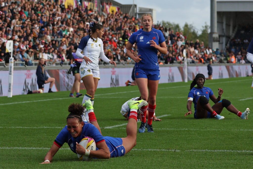 L’équipe de France a assuré dimanche sa qualification pour les quarts de finale de la Coupe du monde de rugby en écrasant le Brésil 84-5, avec quatorze essais inscrits contre l’équipe la plus faible de la compétition, dimanche à Exeter.Les Bleues profitent de la victoire surprise de l’Afrique du Sud contre l’Italie plus tôt dans la journée (29-24), pour s’assurer l’une des deux premières places du groupe D. Elles devront battre les Sud-Africaines pour prendre la première place et s’éviter, a priori, d’affronter les doubles championnes du monde en titre néo-zélandaises ensuite. Contre l’équipe la plus faible de la compétition selon le classement mondial (25e, contre 4e pour la France), les coéquipières de la demi de mêlée Pauline Bourdon Sansus, de retour après avoir purgé deux matches de suspension, ont parfaitement répété leurs gammes offensives. “Ce match était l’opportunité de mettre en place le projet et monter en puissance. C’est fait, on a passé un cap par rapport à la semaine dernière. On sait qu’on doit encore travailler dans certains secteurs mais on est contents de ce que les filles ont produit”, a déclaré après le match la co-sélectionneuse Gaëlle Mignot. Beaucoup des joueuses ont mis la main à la patte, avec notamment des doublés d’Arbey, Boulard, Ménager et d’Okemba. Mais les Bleues n’ont pas battu leur record de la victoire la plus large, qui reste le 99-0 contre le Japon en 1994.Leur premier essai, dès la cinquième minute de jeu, a montré la domination sur tous les secteurs du jeu: après une mêlée qui a avancé de plusieurs mètres, Morland, Champon, Bourdon Sansus et Vernier ont progressé à chaque prise de balle dans l’axe. Bourdon Sansus a ensuite écarté sur les ailes où l’arrière Emilie Boulard est allée aplatir. Sur le renvoi des Brésiliennes, les Françaises ont avancé de 80 mètres, avec une percée d’Annaëlle Deshaye puis un jeu au pied de Lina Queyroi pour que Marie Morland marque de la meilleure des manières, sa première cape en bleue.- Premier essai brésilien au Mondial -Critiquée lors de la première victoire contre l’Italie (24-0) pour leur jeu offensif, les Bleues ont continué de s’en donner à coeur joie, avec neuf essais marqués à la pause, même si la buteuse Lina Queyroi, perturbée par le vent, a laissé cinq transformations en route (53-0). Pauline Bourdon Sansus, désignée femme du match, n’a pas cessé de jouer vite pour profiter des espaces. Le rythme des essais bleus a un peu baissé en début de seconde période, avec seulement une réalisation de Séraphine Okemba (43) durant le premier quart d’heure. Les Brésiliennes, largement soutenues par le public, ont tenu davantage le ballon et le rythme a été haché par les changements. Mais les vagues françaises ont continué ensuite de déferler sur l’en-but brésilien, avec au total cinq nouveaux essais en seconde période.”On a proposé un beau jeu, on a réussi à mettre notre jeu en place et je pense que le score le prouve. Tout le monde ne met pas 80 points à une belle équipe du Brésil. On a montré qu’on était présentes et prêtes pour la Coupe du Monde”, a salué la capitaine Marine Ménager. Les Bleues peuvent tout de même regretter leur déchet en touche, ainsi que d’avoir laissé Bianca Silva aller marquer le premier essai de l’histoire de Brésil dans un Mondial. Elles peuvent désormais se tourner vers l’Afrique du Sud, une opposition bien plus coriace mais sur le papier nettement dans leur corde, à condition qu’elles maîtrisent la puissance des Women Springboks.