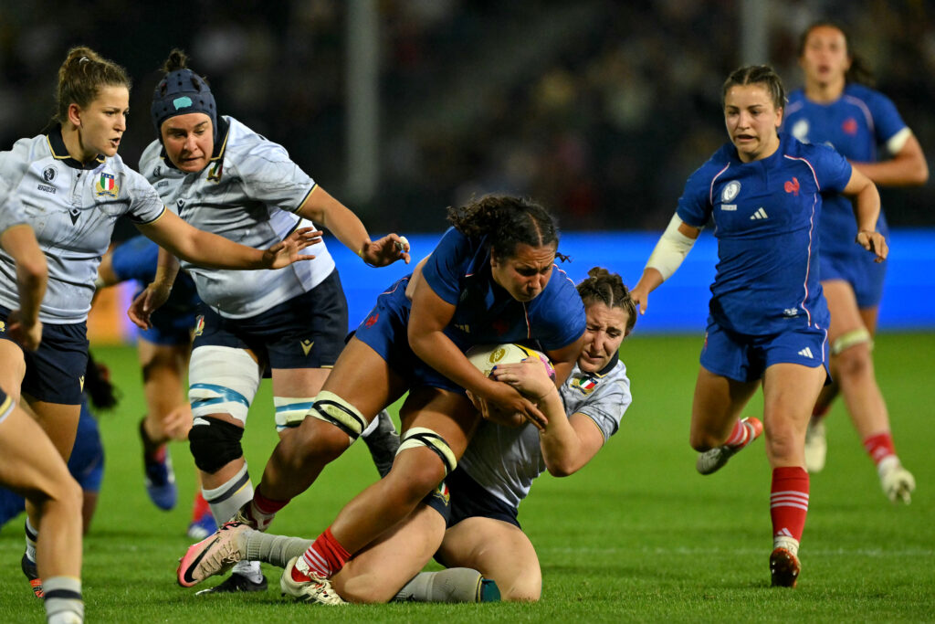 Le XV de France a fait un grand pas vers la première place de son groupe en battant l’Italie (24-0) pour son premier match du Mondial-2025 samedi à Exeter, dans un match où les Bleues ont longtemps peiné à faire des différences. Pour s’extraire de la phase de groupes, la France est sur la voie royale après avoir disposé de son adversaire sur le papier le plus dangereux de la poule D grâce à des essais de Grisez (27), Khalfaoui (45) et Escudero (62). Les deux prochains matches, contre le Brésil et l’Afrique du Sud, des équipes bien plus faibles sur le papier, devraient permettre aux Bleues de terminer nettement premières de leur poules pour s’éviter, probablement, de croiser la Nouvelle-Zélande en quarts. Mais pour la suite de la compétition, les 7.052 spectateurs du Sandy Park d’Exeter, globalement acquis à la cause des Italiennes, ont vu peu de forces et beaucoup de manques des Françaises qui pourraient leur coûter si elles veulent enfin dépasser les demi-finales, leur plafond de verre dans toutes leurs participations.Ce plafond de verre avait semblé immense lors de l’unique match de préparation des Bleues, contre l’Angleterre, meilleure nation mondiale (défaite 40-6).”On sait qu’on en a encore sous la pédale. On sait qu’on va pouvoir encore développer des choses, s’améliorer. Mais on a besoin de temps de jeu. On a confiance au groupe quand on voit ce qu’on est capables de faire sur le Tournoi des six nations”, a assuré le co-sélectionneur David Ortiz en zone mixte après le match.Parmi les quelques satisfactions, la mêlée française a été outrageusement dominante, récupérant des ballons même sur introduction italienne, l’ailière Joanna Grisez a gardé ses jambes de feu, la troisième ligne Charlotte Escudero a été infatigable au combat, grattant trois ballons, et l’arrière Morgane Bourgeois est toujours d’une grande précision face aux perches. Pour le reste, le match a longtemps été frustrant, haché par la maladresse des deux équipes, à l’image du coup d’envoi du match mal réceptionné par l’Italienne Alissa Ranucchi.- l’éclair de Grisez -L’en-avant a entraîné une phase de sept minutes de possession française dans les 22 mètres italiens, à l’issue desquelles les Bleues sont ressorties sans aucun point, incapables de mettre de la vitesse dans leur transmission et de mettre à mal la défense acharnée des Italiennes.Comme lors de nombreux matches cette année, les attaques françaises n’ont pas été assez tranchantes, avec des avants émoussés et des sorties de balles lentes et sans aucune combinaison. Les Bleues ont réussi à contenir les Italiennes dans leur camp, mais c’est aussi en raison des nombreuses fautes de main italiennes, une fois qu’elles parvenaient dans le camp français. Les Italiennes sont entrées pour la première fois dans les 22 mètres bleus après la 50e minute de jeu. Au terme de la première période, seul l’intervalle trouvé par Joanna Grisez, et sa course de 40 mètres jusque dans l’en-but (27) a apporté de la lumière dans le match.Les Bleues se sont vite mises à l’abri au retour des vestiaires, avec un essai de la pilier Assia Khalfaoui (45, 17-0) après une bonne séquence bleue, avant que Charlotte Escudero ne passe en force un troisième essai. Les Italiennes ont ensuite réagi en se montrant davantage dangereuses, sans réussir à marquer de points. “Si on prend les fondamentaux dans lesquels on s’était ciblé des objectifs, on est nettement et clairement là-dedans”, a retenu David Ortiz, soulignant notamment la défense française.Mais l’impression laissée est très loin de celle des Anglaises, vendredi lors du match d’ouverture, et contre qui elles pourraient tomber en demi-finale. Contre, les États-Unis, un adversaire certes un peu plus faible au classement mondial que l’Italie, les coéquipières de la meilleure joueuse de monde en 2024, Ellie Kildunne ont marqué 11 essais et gagné 69-7.