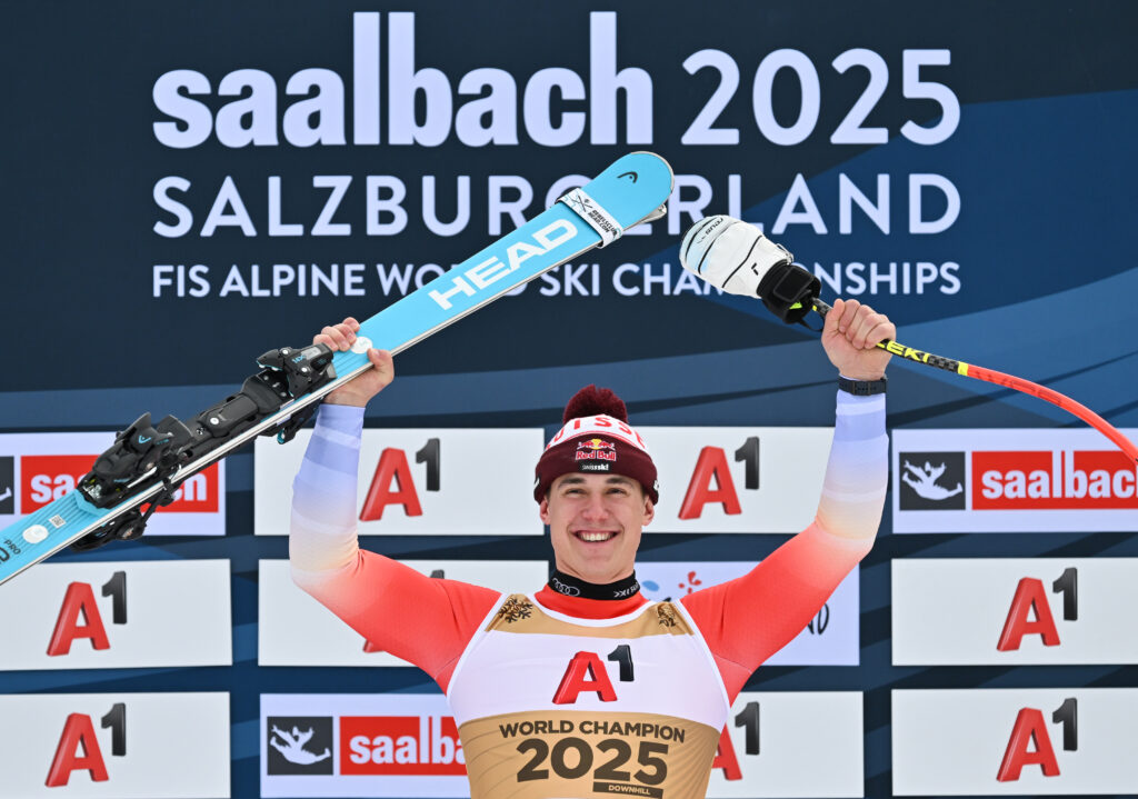Les skieurs suisses poursuivent leur sans faute aux Championnats du monde de ski à Saalbach en Autriche : après la démonstration de Marco Odermatt en super-G vendredi, le jeune Franjo Von Allmen a été sacré dimanche en descente.En prenant tous les risques, le colosse de 23 ans seulement a décroché l’or dans la discipline reine du ski, pour ses premiers Championnats du monde, et moins de deux ans après son arrivée sur le circuit mondial.L’ambiance était survoltée dans l’aire d’arrivée avant le passage de Von Allmen, dossard 11 dimanche. Quelques minutes avant lui, la star nationale Vincent Kriechmayr, embêté par une blessure au genou depuis mi-janvier, réalisait une manche incroyable pour prendre la tête provisoire. Mais les espoirs d’une nouvelle victoire autrichienne en vitesse, après l’or de Stephanie Venier jeudi en super-G, ont été balayés par la fusée Von Allmen, plus solide en fin de manche et qui a finalement devancé Kriechmayr, deuxième, de 24 centièmes. – “Il a tout d’un grand” -Alexis Monney, qui partage sa chambre avec Von Allmen à Saalbach, complète le podium (+ 31 centièmes) et ce sont donc deux Suisses qui repartent avec une médaille dimanche, alors même que le leader helvète Marco Odermatt, champion du monde en titre en descente et vainqueur du super-G vendredi, a été décevant (5e à 66 centièmes).”Je ne m’attendais pas du tout à gagner”, a savouré Von Allmen après sa course. “Avec Alexis Monney sur le podium, c’est juste dingue, on va faire une grosse fête ce soir je pense”, a-t-il ajouté.”J’ai choisi le meilleur moment pour pouvoir gagner ma première descente”, a-t-il poursuivi alors qu’il a tourné tout l’hiver autour d’une première victoire dans la discipline, avec trois deuxièmes places.”Il a tout d’un grand”, a affirmé le Français Nils Allègre, 10e dimanche. “Honnêtement je pense que ça va être un énorme cador en descente. Il a un gros gabarit, il a un toucher de neige incroyable. Quand il aura encore un peu plus d’expérience, ce sera dur d’aller le chercher.” Si les Suisses étaient attendus sur le podium de la descente vu leur régularité au meilleur niveau depuis le début de l’hiver, le public misait surtout sur Marco Odermatt, tenant du titre et en pleine confiance après sa victoire en super-G vendredi. “Avant de partir je savais que ça allait être chaud car je savais que Franjo, Alexis (Monney) et Vincent (Kriechmayr) avaient fait des superbes manches”, a raconté Odermatt, cinquième dimanche. “Donc j’y suis allé à fond mais malheureusement j’ai fait deux erreurs.””A l’arrivée, je n’étais pas surpris, mes jeunes coéquipiers ont fait un travail de dingue. Quand je ne gagne pas, c’est eux qui gagnent, c’est top”, a ajouté Odermatt. – Kriechmayr de retour -Au-delà des Suisses qui raflent trois des cinq premières places, la performance du jour revient à l’Autrichien Vincent Kriechmayr, qui a su profiter des avantages d’une compétition à domicile pour réaliser une descente maîtrisée de A à Z. Le double champion du monde de la descente et du super-G en 2021 a réalisé un exploit en prenant la deuxième place, lui qui s’est fait une entorse au genou le mois dernier. Encore convalescent, il n’avait pas pris part à tous les entraînements officiels.”Ce sport est formidable mais sans les fans, ce ne serait rien”, a exulté l’Autrichien, acclamé par un public surexcité. “Je savais que j’allais devoir produire mon meilleur ski pour battre les Suisses et aujourd’hui, il n’y en a qu’un seul qui a réussi à faire mieux que moi”, a-t-il souri.Comme depuis le début des Championnats du monde, les résultats ont été moins bons côté Français, avec un seul Bleu dans le top-10. Nils Allègre a terminé 10e à 1 sec 34 de Von Allmen, devant Maxence Muzaton (18e), Nils Alphand (24e) et Adrien Théaux (32e).La compétition se poursuit mardi avec le combiné (descente, slalom) par équipes non mixtes, nouveauté au programme avant son introduction aux JO-2026.