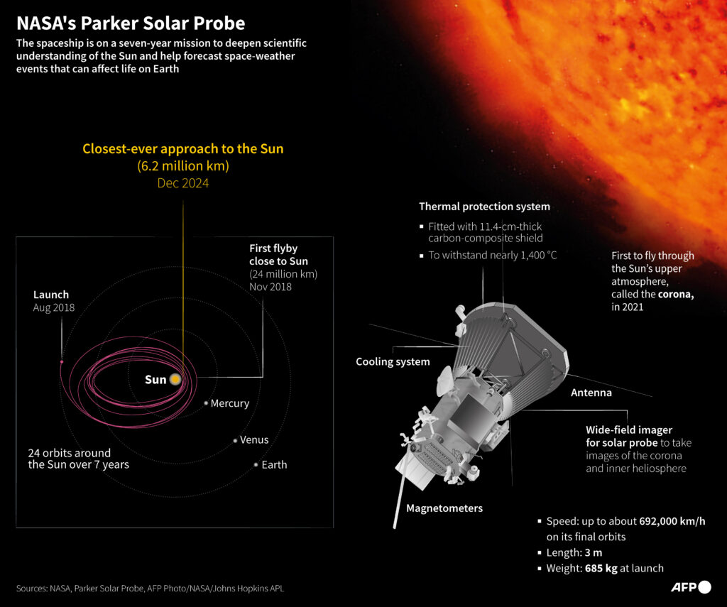 NASA’s pioneering Parker Solar Probe made history Tuesday, flying closer to the Sun than any other spacecraft, with its heat shield exposed to scorching temperatures topping 1,700 degrees Fahrenheit (930 degrees Celsius).Launched in August 2018, the spaceship is on a seven-year mission to deepen scientific understanding of our star and help forecast space-weather events that can affect life on Earth.Tuesday’s historic flyby should have occurred at precisely 6:53am (1153 GMT), although mission scientists will have to wait until Friday for confirmation as they lose contact with the craft for several days due to its proximity to the Sun.”Right now, Parker Solar Probe is flying closer to a star than anything has ever been before,” at 3.8 million miles (6.1 million kilometers) away, NASA official Nicky Fox said in a video on social media Tuesday morning. “It is just a total ‘yay, we did it,’ moment.”If the distance between Earth and the Sun is the equivalent to the length of an American football field, the spacecraft should have been about four yards (meters) from the end zone at the moment of closest approach — known as perihelion.”This is one example of NASA’s bold missions, doing something that no one else has ever done before to answer long-standing questions about our universe,” Parker Solar Probe program scientist Arik Posner said in a statement on Monday.”We can’t wait to receive that first status update from the spacecraft and start receiving the science data in the coming weeks.”So effective is the heat shield that the probe’s internal instruments remain near room temperature — around 85F (29C) — as it explores the Sun’s outer atmosphere, called the corona.Parker will also be moving at a blistering pace of around 430,000 mph (690,000 kph), fast enough to fly from the US capital Washington to Japan’s Tokyo in under a minute.”Parker will truly be returning data from uncharted territory,” said Nick Pinkine, mission operations manager at the Johns Hopkins Applied Physics Laboratory (APL) in Laurel, Maryland. “We’re excited to hear back from the spacecraft when it swings back around the Sun.”By venturing into these extreme conditions, Parker has been helping scientists tackle some of the Sun’s biggest mysteries: how solar wind originates, why the corona is hotter than the surface below, and how coronal mass ejections — massive clouds of plasma that hurl through space — are formed.The Christmas Eve flyby is the first of three record-setting close passes, with the next two — on March 22 and June 19, 2025 — both expected to bring the probe back to a similarly close distance from the Sun.