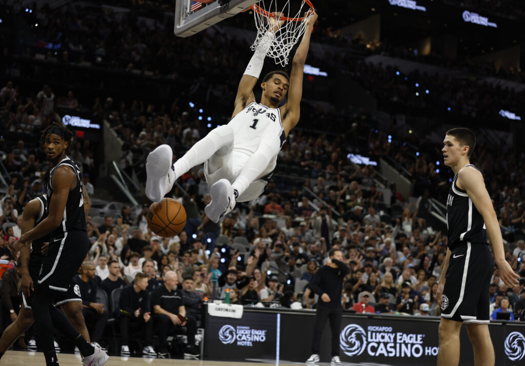 Portés par Victor Wembanyama, les San Antonio Spurs ont aligné une troisième victoire en trois journées de NBA, s’imposant face aux Brooklyn Nets (118-107) dans une soirée d’hommage à Gregg Popovich, 76 ans, qui fut leur entraîneur historique.La star française de la NBA a fini la partie avec 31 points, 14 rebonds, six contres, quatre passes et trois interceptions.De retour à la compétition après huit mois d’interruption pour se remettre d’une thrombose veineuse, Wemby poursuit sur sa lancée. Il s’était déjà offert une démonstration à 40 points pour son retour mercredi dernier à Dallas (victoire 125-92) puis 29 points, 11 rebonds et 9 contres vendredi face à la Nouvelle-Orléans (120-116 après prolongation).Trois matches, trois victoires: malgré les 40 points en face de Cam Thomas, les Spurs prolongent leur début de saison sans faute.Les Nets étaient pourtant revenus à une longueur à 2 min 47 sec de la fin du match (108-107). Mais il n’y a alors plus eu qu’une seule équipe sur le parquet, les Spurs terminant par un cinglant 10-0, dont deux lancers francs et un dunk de leur prodige français dans les ultimes secondes.La soirée a également été marquée par l’hommage rendu à Gregg Popovich. Le coach historique des Spurs, victime d’un AVC en novembre dernier, a laissé en cours de saison dernière les commandes à Mitch Johnson.Arrivé à sa tête en 1996, Popovich a conduit la franchise texane à cinq titres de champions NBA. Lui-même a été désigné à trois reprises coach de l’année. Il est toujours dans l’organigramme des Spurs, au poste de président chargé des opérations basket-ball de la franchise.Pour lui rendre hommage, les Spurs ont accroché une nouvelle bannière au plafond de leur salle avec l’inscription “Pop 1.390” ornée de cinq étoiles: 1.390 comme le nombre de matches remportés par Popovich en NBA, cinq comme ses titres NBA.