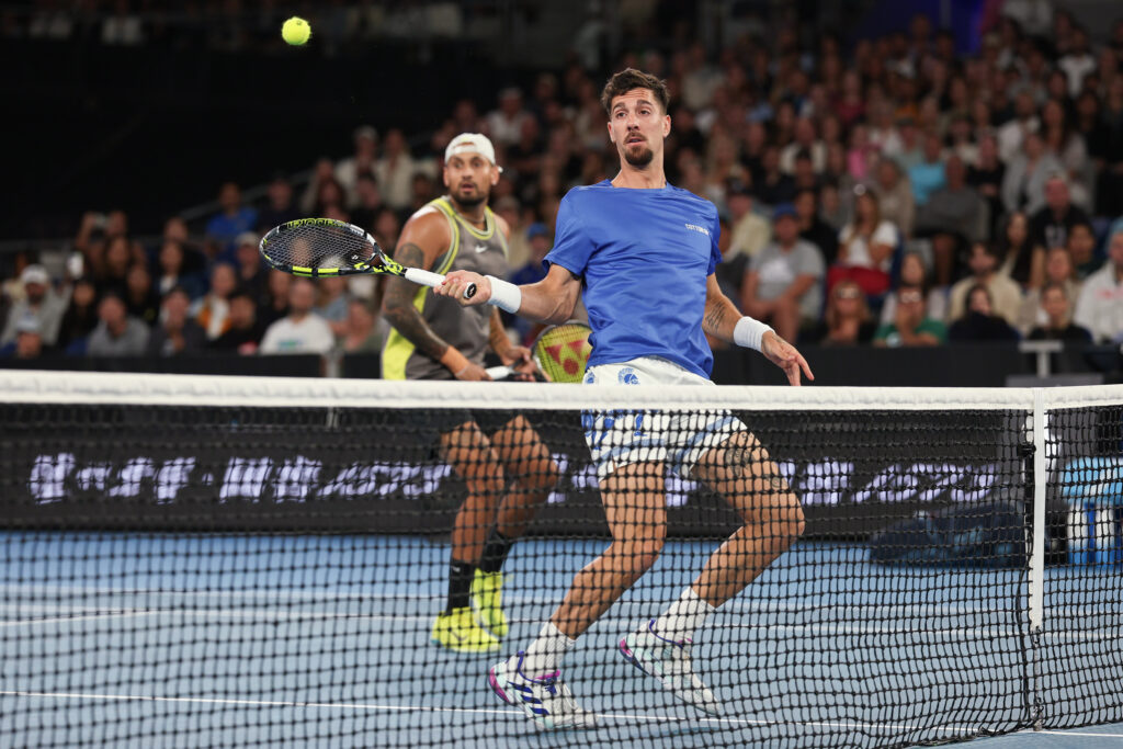 Des retrouvailles au goût d’adieux pour les “Special K” du tennis australien: vainqueurs de l’Open d’Australie en double en 2022, Nick Kyrgios et Thanasi Kokkinakis ont renoué un set et demi avec leur public à Melbourne avant que leurs corps meurtris ne les poussent à abandonner.”La John Cain Arena est à guichets fermés”, proclame un écran bleu surplombant l’entrée de l’enceinte où doit se reformer la paire préférée du public local, après trois ans d’attente.Quelques minutes avant le début du match, les tribunes sont effectivement déjà combles ou presque.Écharpe bleue et blanche autour du cou, Voula Magellas patiente dans les gradins avec sa soeur et sa fille. “On est venues voir les deux Grecs”, assure-t-elle à l’AFP en référence à Kokkinakis et Kyrgios, qui ont des origines helléniques.”Ils sont super drôles, ils font des choses marrantes avec la balle… Je les adore!” déclare cette spectatrice dont les parents viennent tous deux d’une île grecque.Quelques rangées plus haut, Amanda et son fils Jack savourent leur “coup de chance” puisqu’en achetant leurs billets, ils ne savaient pas qu’ils verraient jouer les “Special K”, comme la paire est affectueusement surnommée en Australie.Casquette sur la tête comme Nick Kyrgios, Jack a pourtant un faible pour Kokkinakis, “probablement mon joueur préféré”.- “Come on Nick! Let’s go Kokki” -Soudain, une clameur fend la foule: le duo entre dans l’arène.Incertain jusqu’au dernier moment en raison d’une blessure à l’épaule, Kokkinakis a enfilé un short orné de dessins de guerriers grecs, un clin d’oeil vestimentaire aux nombreux drapeaux helléniques et australiens déployés dans les tribunes.”Je suis vraiment désolé” pour James Duckworth et Aleksandar Vukic, l’autre paire de double présent sur le court, commente le jeune Jack. “C’est clair que tout le stade va encourager Nick et Thanasi” plutôt que leurs adversaires, pourtant australiens eux aussi, anticipe-t-il.Dès le début du match et les difficultés évidentes de Kokkinakis au service, l’enthousiasme des spectateurs se teinte d’anxiété, nourrie par les grimaces de douleur de l’Australien.Kyrgios, touché lui par une blessure abdominale à quelques jours de l’Open d’Australie et quasi absent du circuit ATP pendant deux ans, essaie bien de dérider le public.Volées croisées imparables, gifles en coup droit, smashs et amorties: le “kid de Canberra”, comme il se surnomme volontiers, montre qu’il n’a rien perdu de son toucher de balle. A chaque point gagné, il vient haranguer la foule, qui le lui rend bien. “Come on Nick! Let’s go Kokki, let’s go”, entonne-t-elle sans relâche, rugissant de plaisir quand les compères parviennent à effacer un break.Kyrgios et Kokkinakis perdent finalement la première manche 7-5 et jettent l’éponge quelques minutes plus tard, plongeant la John Cain Arena dans la détresse.- “On peut toujours faire des dégâts” -“Mon docteur m’a recommandé de ne pas jouer ce match”, confie Kokkinakis en conférence de presse. “Je souffre énormément” mais “je voulais tellement remonter sur le court” avec Kyrgios, coiffé devant la presse d’une casquette floquée du mot “outgoing” (“sortant”).”On savait qu’une foule de gens nous attendait. Dans n’importe quelles autres circonstances, je n’aurais certainement pas mis un pied sur le court”, poursuit-il.”J’ai senti dès le début du match que le public était prêt à entrer en ébullition”, ajoute Kyrgios, jamais avare d’une hyperbole. Quant à savoir si le public australien reverra un jour ses héros de 2022 rejouer ensemble, Kyrgios botte en touche.”C’est possible. En pleine possession de nos moyens, j’ai l’impression qu’on peut toujours faire des dégâts en double”, juge le finaliste de Wimbledon en 2022, qui aura 30 ans en avril.Mais avec l’émergence de talents comme le Brésilien de 18 ans Joao Fonseca, “Thanasi et moi sommes un peu devenus les vieux dans les vestiaires”, souligne Kyrgios.