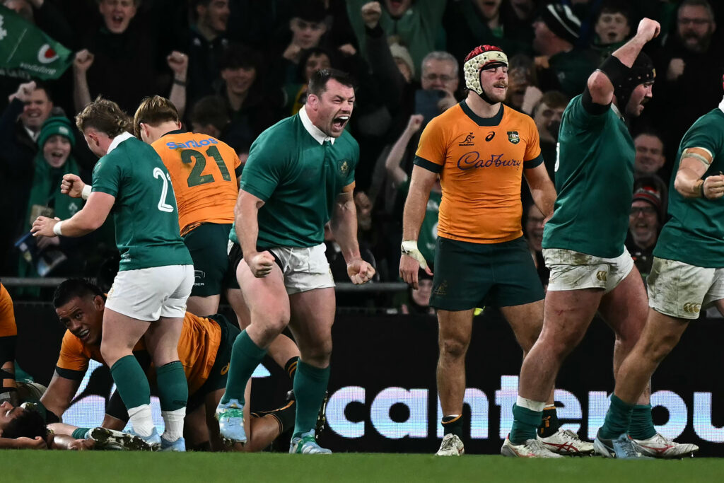 L’Irlande, d’abord maladroite, s’est reprise pour passer trois essais à l’Australie (22-19), samedi à Dublin, et fêter la 134e sélection du pilier Cian Healy, désormais seul détenteur du record national.Le XV du Trèfle a remporté un duel serré face à son ancien sélectionneur,Joe Schmidt, grâce à une seconde période plus maîtrisée, dans un Aviva stadium à guichets fermés.”Il y a du soulagement, mais aussi du plaisir”, a résumé le capitaine Caelan Dories au micro de TNT Sports. “C’est une équipe de qualité, avec la patte de Joe Schmidt, et nous savions que ce serait du haut niveau”.Les Irlandais ont marqué trois essais par Josh van der Flier (23e), Caelan Doris (49e) et Gus McCarthy (73e). Ils n’en ont encaissé qu’un seul (19e), au début d’une rencontre où ils ont enchaîné fautes de main et sautes de concentration.Les Australiens étaient arrivés mal en points en Europe, encore sonnés par leur Championship raté cet été (cinq défaites en six matches), et une élimination piteuse en phase de groupes de la Coupe du monde 2023.La virée européenne n’a pas été parfaite mais elle leur a permis d’afficher des progrès, comme lors de la victoire initiale contre l’Angleterre (42-37), la première depuis neuf ans à Twickenham.- Rendez-vous l’été prochain -Ils ont semé quelques promesses dans le sillage de Joseph-Aukuso Suaalii, phénomène venu du XIII, de l’ouvreur Noah Lolesio, auteur samedi de quatre pénalités et d’une belle transformation en coin, et de Max Jorgensen, auteur de leur seul essai (19e, 0-10).Leur prochain défi sera d’accueillir l’été prochain la tournée des Lions britanniques et irlandais, que dirigera l’actuel sélectionneur de l’Irlande, Andy Farrell.L’ancien adjoint de Schmidt, à qui il a succédé en 2019, termine lui les matches de novembre sur une victoire étriquée mais volontaire, courageuse, à laquelle a pris part Sam Prendergast.A 21 ans, le jeune demi d’ouverture du Leinster a de nouveau rendu une belle copie et poussé au maximum la concurrence avec Jack Crowley, qui l’a remplacé en seconde période. Le double tenant du titre aura donc encore une belle tête de vainqueur, dans deux mois, au début du Tournoi des six nations.Avec ou sans Healy? Le pilier de 37 ans s’est en tout cas offert une 134e sélection mémorable, samedi dans son jardin de Dublin et sous les yeux de Brian O’Driscoll, l’ancien détenteur du record national.Les yeux fermés pendant l’hymne, noyé par les applaudissements à son entrée, le poing rageur après le 3e essai, le joueur du Leinster a terminé la journée avec la remise d’une “cape” (casquette) où figurait la date de ses débuts: 2009, une longévité exceptionnelle en première ligne.