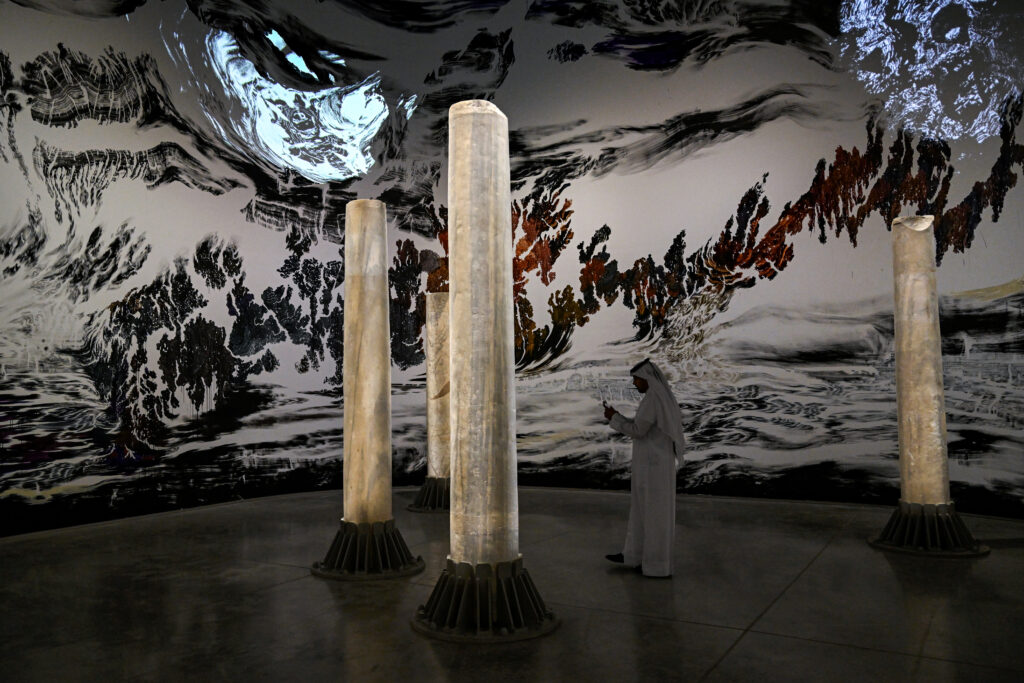 Under a vast canopy of tents in the Saudi city of Jeddah, religious artefacts are on display alongside contemporary art pieces, part of the kingdom’s bid to transform its ultraconservative image.The second edition of the Islamic Arts Biennale, titled “And All That Is In Between”, features as its centrepiece segments of the “kiswa”, the black cloth embroidered with gold and silver that covers the Kaaba, the cubic building towards which all Muslims pray.Hundreds more works are on display at the west terminal of King Abdulaziz International Airport in the coastal city, including valuable objects on loan from London’s Victoria & Albert Museum and the Louvre in Paris, and rare artefacts from the Vatican Library such as a medieval Quran in Hebrew script.”This bringing together of the contemporary and the past really emphasises the change that Saudi Arabia is going through,” said Saudi artist Muhannad Shono, curator of the exhibition.Home to Islam’s holiest sites, the kingdom has long been dominated by Wahhabism, a strict interpretation of Islam that prohibits the representation of human and animal figures.As a result of the prohibition of such depictions in most Sunni Muslim schools of thought, geometric patterns came to be widely prevalent in Islamic art.But the biennale in Jeddah features medieval Persian illuminations, including royal portraits, as well as a fountain designed by Yemeni-Indonesian artist Anhar Salem whose mosaic tiles, assembled by colour using artificial intelligence, are made up of avatars sourced online.- ‘Traditional conceptions’ – “We have traditional conceptions of Islam and its history, which I feel we should begin to re-examine from a new perspective,” said visitor Abdelelah Qutub, a 31-year-old architect from Mecca.A few metres (yards) away, Franco-Lebanese artist Tamara Kalo had recreated the camera obscura, the precursor to the modern camera invented in the 11th century by Muslim philosopher Ibn al-Haytham (Alhazen).Kalo told AFP her installation, made out of copper, sought to raise the question of “what it means to see and what it means to be a witness”.The exhibition has also encouraged artists to be bold with scale, as can be seen from a massive disc covered in petrol — a nod to Saudi Arabia’s position as the world’s leading crude exporter — that spins endlessly.Its creator, Italian artist Arcangelo Sassolino, said: “For me it represents time… it’s something that keeps evolving while we’re watching the piece.”Under his “Vision 2030”, de facto Saudi leader Crown Prince Mohammed bin Salman has sought to transform the kingdom’s image, weighed down by decades of repression and ultraconservatism.According to James Dorsey of the National University of Singapore, Saudi authorities are seeking to address what he described as a “reputation deficit”, having long been considered a “secretive, ultraconservative kingdom”.Efforts to project “openness”, including the biennale, are “key to the success of Vision 2030″, he said.- ‘Share space with the West’ -Strategically located in a terminal adjacent to the one reserved for Muslims on a pilgrimage to Mecca, the Jeddah biennale attracts a mix of both art enthusiasts and pilgrims.”We had pilgrims coming from over the road here to see the Mecca and Medina pavilions last time,” said art historian Julian Raby.The first edition in 2023 attracted 600,000 visitors — approaching the Venice Biennale’s 700,000 visitors in 2024.Now, the Islamic Arts Biennale aims to exceed a million visitors, many from abroad.”That internationalism is exactly the opposite of how many people consider Saudi Arabia. They look at Saudi Arabia and consider it as a cloistered country,” said Raby.”The Islamic world has never been cloistered, it’s been in dialogue, dynamicIn front of her monumental sculpture, a black steel bush of roses floating above a fountain, Jordanian artist Raya Kassisieh was proud to benefit from the platform provided by the biennale.”We are able and at the level to converse and share space with the West,” she said.