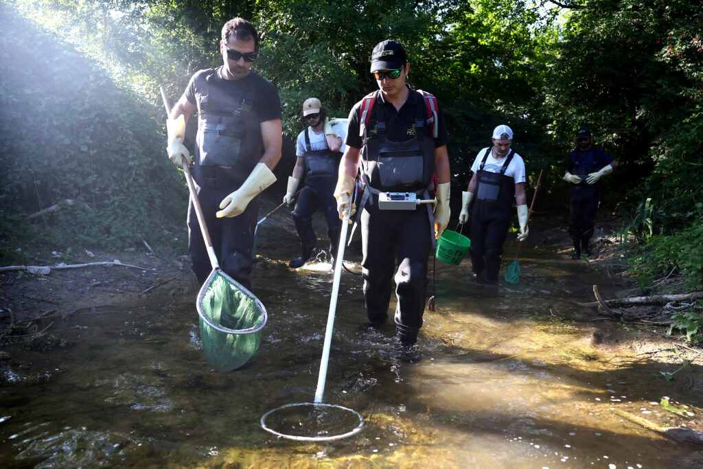 “Ça va être un désert ici”. Armés d’épuisettes, des pêcheurs sauvent des centaines de poissons d’une mort certaine en les déplaçant d’un cours d’eau asséché vers la Charente, plus remplie, à quelques kilomètres d’Angoulême.”Il ne reste presque plus que des flaques d’eau”, déplore Valentin Hortolan, directeur de la Fédération départementale de pêche, les pieds à peine immergés jeudi dans la Nouère. Cet affluent de la Charente, situé dans le département éponyme, est en rupture d’écoulement sur une quinzaine de kilomètres, plus de la moitié de sa longueur. Une situation qui est loin d’être unique en France: la quasi-totalité (90) des départements français étaient soumis jeudi à des restrictions d’usages de l’eau contre 26 à la même date l’année dernière, selon le site officiel vigieau.gouv.fr. “Sans intervention, tous les poissons ici sont condamnés, ça va être un désert”, s’alarme ce pêcheur. Pour les sauver, cinq membres de la fédération accompagnés de six bénévoles, chaussés de bottes en caoutchouc et munis de seaux, avancent méticuleusement dans le lit presque à sec afin de repérer les poissons encore vivants. À l’aide d’un appareil de pêche électrique, ils génèrent un faible courant dans l’eau, qui paralyse temporairement les poissons et les attire, afin de les pêcher plus facilement. Ils sont ensuite transvasés dans une eau oxygénée, avant d’être relâchés dans un milieu plus adapté à quelques kilomètres de là. – Dixième opération de l’année -Jeudi, environ 260 poissons, capturés sur 800 m, ont échappé à la mort, une “petite” opération pour ces passionnés qui ont commencé les pêches de sauvegarde en 2011. Dans leurs épuisettes, des brochets, des vairons ou encore des chevesnes mais pas de truites, même si “c’est une rivière à truites”, regrette Valentin Hortolan. Un signe, selon lui, “d’un dysfonctionnement global du cours d’eau.”Assis sur un rocher dans ce cours d’eau qu’il connaît par cœur, Philippe Agard, un retraité passionné de pêche depuis ses trois ans, se désole. “Quand il manque de l’eau, ce n’est pas que les poissons, c’est toute la vie de la rivière qui est impactée. C’est à pleurer de voir qu’un patrimoine commun est détruit dans la plus grande indifférence”, déclare-t-il.Cette opération de sauvegarde est leur dixième cette année. “Nous avons un mois d’avance par rapport à l’été 2022”, particulièrement sec, observe Valentin Hortolan.Pourtant le département de la Charente est à “un niveau de sécheresse normale pour un mois de juillet”, constate Nicolas Ilbert, directeur territorial de l’agence de l’eau Adour-Garonne. Mais le bassin charentais est “un territoire plus fragile que les autres et plus impacté par le changement climatique”, précise-t-il.- Des améliorations trop lentes -La difficulté à conserver l’eau en surface s’explique notamment par la composition des sous-sols en calcaire fracturé ou encore par le réaménagement du bassin dans les années 1980, dont l’objectif était d’assécher rapidement les sols pour les cultiver. Une situation renforcée par la canicule du mois de juin et le déficit de précipitations: à Angoulême, les pluies de juillet sont inférieures de 44 % à la moyenne observée entre 1991 et 2020.Si ces pêches de sauvegarde, à l’initiative de la fédération de pêche, sont des solutions temporaires, elles sont loin “d’être une solution miracle ou viable à long terme”, assure Valentin Hortolan. “En 2022 on a eu 1.260 kilomètres de cours d’eau à sec en Charente, et on n’a réussi à intervenir que sur une quinzaine”, explique-t-il.”En 10 ans, il y a eu des améliorations mais ça ne va pas assez vite par rapport à la vitesse du réchauffement climatique”, observe Ludovic Supiot, le vice-président de la Fédération de pêche de Charente. “On n’est pas encore au pied du mur”, relativise ce professionnel de la pêche. “On sait comment on peut s’en sortir, maintenant il faut une volonté” politique et une “prise de conscience collective”, ajoute-t-il.La Fédération de pêche de Charente appelle à “accélérer considérablement le rythme sur les projets de restauration des milieux aquatiques” et “à réduire la pression de prélèvement pour l’irrigation sur ces petits milieux”, complète son directeur.