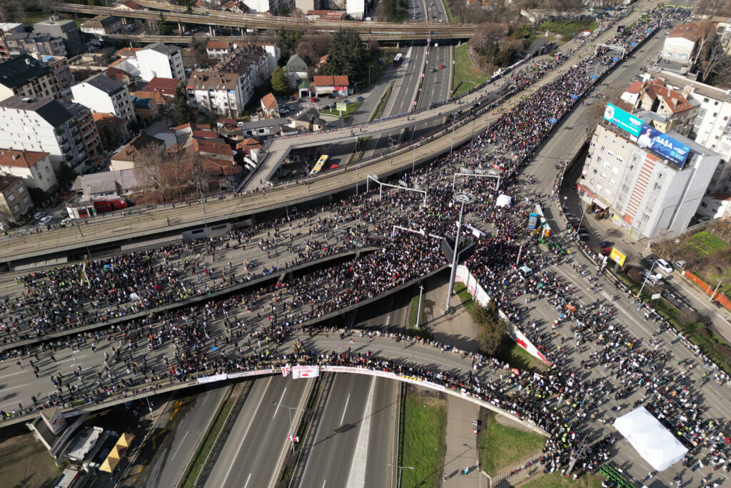 Plusieurs milliers d’étudiants serbes ont entamé lundi le blocage pour 24 heures d’un important nœud routier de Belgrade pour dénoncer la corruption et réclamer, comme depuis des semaines, que toute la lumière soit faite sur l’accident mortel de la gare de Novi Sad.”Tous au blocage”, “tous dans la rue”: sifflets autour du cou, les étudiants regroupés en différents cortèges sont partis vers 09h00 locales de leurs universités pour rejoindre Autokomanda, l’un des principaux échangeurs de Belgrade.Les étudiants y sont arrivées par vague au fil de la matinée, avant d’observer 15 minutes de silence en hommage aux 15 personnes tuées dans l’effondrement de l’auvent en béton de la gare de Novi Sad, deuxième ville de Serbie, le 1er novembre.Une partie de la population voit dans la catastrophe une illustration de la corruption et de la négligence des autorités, dans un pays qui sous la présidence du nationaliste Aleksandar Vucic, au pouvoir depuis 2012, a multiplié chantiers et grands projets.Les revendications sont les mêmes depuis le début de la contestation : la publication de tous les documents relatifs à la rénovation de la gare qui venait d’être achevée par des entreprises chinoise, hongroise et française; l’arrestation des personnes soupçonnées d’avoir physiquement attaqué les étudiants et les professeurs depuis le début des manifestations; l’abandon des poursuites contre les étudiants arrêtés; et une hausse de 20% du budget de l’Enseignement supérieur.”Il n’est pas question de demander un gouvernement de transition, de renverser les autorités ou quoi que ce soit de ce genre. Nous demandons simplement que les institutions fassent leur travail et répondent aux quatre demandes que nous avons formulées. C’est tout”, explique dans la foule Uros Velimirovic, 22 ans, étudiant en ingénierie électrique.”Nous attendons que toutes nos revendications soient satisfaites, et s’ils refusent, alors nous resterons là jusqu’à ce qu’elles le soient”, abonde Tamara Crnogorac, 20 ans, étudiante en sciences. Des dizaines d’agriculteurs sont également arrivés à Belgrade avec l’intention affichée de protéger les étudiants en garant leurs tracteurs autour du rassemblement, tout comme certains clubs de motards de la capitale. Plusieurs étudiants ont été blessés depuis le début des manifestations, par des automobilistes qui avaient forcé les cordons de sécurité, organisés depuis le début par les manifestants eux-mêmes. Vendredi encore, lors d’une manifestation qui a rassemblé plus de 50.000 personnes à Belgrade selon un organisme de comptage indépendant composé de journalistes et de militants, une étudiante a été renversée par une automobiliste de 25 ans, qui a démarré alors qu’elle se trouvait devant sa voiture. Les vidéos, devenues virales, de ces incidents, ont poussé le président serbe confronté à un mouvement de colère sans précédent depuis son arrivée au pouvoir il y a 12 ans, à demander à la police de sécuriser les manifestations. M. Vucic doit s’exprimer à nouveau dans la journée.L’enquête sur l’accident de la gare est toujours en cours, et plus d’une dizaine de personnes ont été inculpées, dont l’ancien ministre des Transports, Goran Vesic.