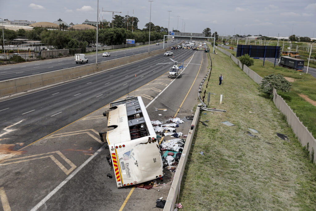 A bus overturned in an area of Johannesburg near South Africa’s main airport early Tuesday, killing at least 12 people, city officials said, with dozens more injured.The bus was carrying more than 50 people to work when it crashed on a busy road near Johannesburg’s OR Tambo International Airport, officials said.Twelve people were killed and 45 others hurt, they said in a statement. “We are lost for words. This is a disaster,” Ekurhuleni city transport official Andile Mngwevu said. The cause of the accident was not immediately known. It forced the closure of the highway leading to the airport. Images from the scene showed the bus on its side. A survivor of the accident told Newzroom Afrika television that it appeared the bus was speeding. Despite sophisticated road networks, South Africa battles with a high rate of road deaths blamed mostly on speeding, reckless driving, unroadworthy vehicles and failure to use seat belts.Four school children were killed Monday and five others injured when two vehicles collided around Ekurhuleni, which lies east of Johannesburg. At least nine people, including a four-year-old child, were killed last week when their bus careered into a ditch in the eastern province of KwaZulu-Natal. The 82-seater bus was carrying congregants returning home from church.