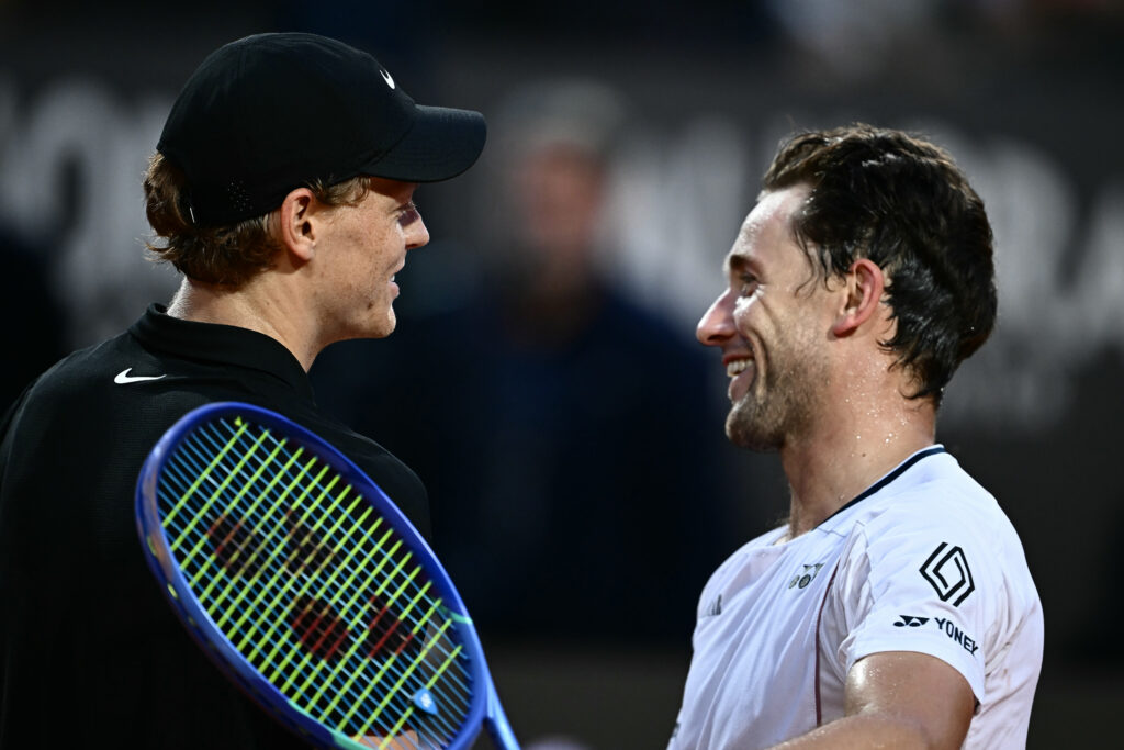 Le tennis italien est au septième ciel à Rome: son héros Jannik Sinner, irrésistible, a donné une leçon à Casper Ruud en quarts de finale jeudi et Jasmine Paolini s’est hissée en finale, un première pour une Italienne depuis 2014.Sur le toit du monde grâce aux succès de ses équipes nationales l’automne dernier dans la Billie Jean King Cup (ex-Fed Cup) et en Coupe Davis, l’Italie attend, depuis 1985 pour les femmes et depuis 1976 pour les hommes, qu’un de ses représentants remporte enfin “ses” Internationaux.Elle touche peut-être au but avec trois atouts de choix pour mettre fin à cette disette, Sinner et Lorenzo Musetti (9e mondial) dans le dernier carré, et Paolini en finale. L’Italie peut même rêver à un double triomphe la même année, inédit, “a casa”.Confronté à son premier joueur du Top 10 mondial depuis son retour à la compétition, Sinner n’a pas fait de détails contre Ruud. Il a écoeuré et essoré 6-0, 6-1 le N.7 mondial, pourtant récent vainqueur du Masters 1000 de Madrid et double finaliste à Roland-Garros (2022, 2023).L’Italien, comme transfiguré par sa rencontre avec le nouveau pape Leon XIV mercredi au Vatican, n’a laissé à Ruud que sept petits points dans un premier set bouclé en 27 minutes dans un Campo centrale partagé entre admiration et incrédulité, tant le N.1 mondial semblait sur son nuage.- “Comme jouer contre un mur” -Breaké d’entrée dans le second set, Ruud a fini par remporter un jeu qu’il a fêté en levant les bras, pour revenir à 2-1.”Il était partout (…) C’était comme jouer contre un mur qui me renvoyait des balles à plus de 100 km/h à chaque fois”, a admiré le Norvégien.Mais la machine Sinner, de retour d’une suspension de trois mois pour deux contrôles antidopage positifs à un anabolisant via une contamination accidentelle, a repris son démonstration et a conclu son festival en un peu plus d’une heure de jeu (1h03).”Je suis ici pour comprendre où j’en suis, pour savoir ce que je peux faire (…) pour le moment, je ne me concentre pas sur les résultats”, a-t-il assuré.Son prochain adversaire, l’Américain Tommy Paul (12e mondial), a du souci à se faire: il s’est certes qualifié pour la deuxième année consécutive pour le dernier carré à Rome en dominant le Polonais Hubert Hurkacz (31e) 7-6 (7/4), 6-3, mais il ne semble pas avoir les épaules assez large pour contrarier Sinner.- Deux Italiens dans le dernier carré -Avec Musetti qui sera opposé lui à l’Espagnol Carlos Alcaraz (3e), Sinner, 23 ans, a déjà écrit un nouvelle page de l’histoire du tennis italien: c’est la première fois depuis le début de l’ère Open (1968) que deux Italiens sont en demi-finales à Rome, la première fois aussi qu’il y a deux Italiens demi-finalistes d’un même Masters 1000 depuis la création de cette catégorie en 1990.Paolini a été menée 4-1 par la surprise américaine, Peyton Stearns (42e) en pleine confiance après avoir notamment éliminé sa compatriote Madison Keys, la Japonaise Naomi Osaka et l’Ukrainienne Elina Svitolina.Mais poussée par le public romain, l’Italienne, N.5 mondiale, n’a plus laissé que deux jeux à son adversaire pour s’imposer 7-5, 6-1.”Si on m’avait dit il y a deux ans ou même il y a un an qu’un jour je serai en finale ici, je ne l’aurais pas cru”, a-t-elle souri.Samedi, la finaliste à Roland-Garros et Wimbledon en 2024 sera opposée pour le titre à l’Américaine Coco Gauff, 3e mondiale, qui est venue à bout après 3h32 de jeu de la Chinoise Zheng Qinwen, 8e mondiale et championne olympique 2024 7-6 (7/3), 4-6, 7-6 (7/4).Paolini, 29 ans, est la première Italienne en finale au Foro Italico depuis onze ans et le parcours de Sara Errani, sa partenaire de double. Errani, présente dans la box de Paolini jeudi, s’était ensuite lourdement inclinée en finale face à l’Américaine Serena Williams.