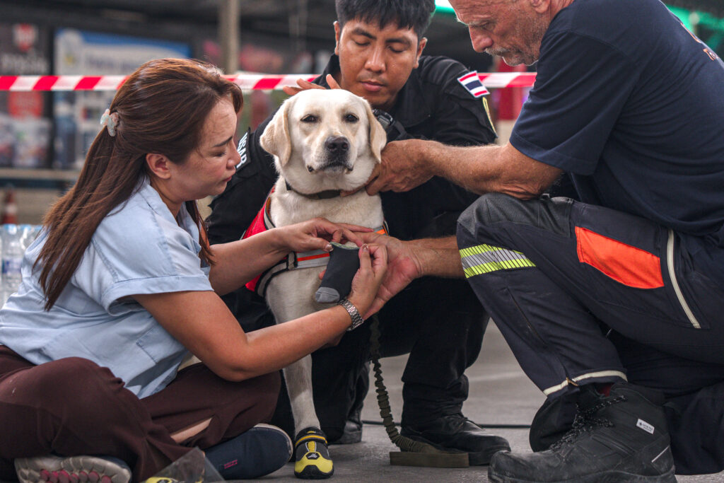 Thailand’s search and rescue dogs are taking on the role of emotional support animals for grieving relatives of victims of a Bangkok skyscraper flattened in a deadly earthquake.The 30-storey high-rise under construction collapsed in seconds on Friday when a magnitude 7.7 earthquake struck neighbouring Myanmar, with effects felt as far as the Thai capital.As of Tuesday, 13 people — thought to be on-site construction workers — were pronounced dead, with nine injured and more than 70 still believed to be buried in the rubble.Their tearful families waited near the scene of the collapse, watching on with hopes fading as rescue workers and diggers scraped through the mountain of rubble.But their faces lit up when they saw golden retrievers Lek and Safari — decked out in official search uniforms — brought to the relatives’ waiting area.Several canine teams have been deployed to help the search and rescue operation at the site, including from the military and police.Rescue workers have recruited 11 dogs — not just in their usual capacity sniffing through the debris for signs of life, but also as emotional support for victims’ friends and relatives.Alongkot Chukaew, deputy director of K9 USAR (urban search and rescue) Thailand, which handles the trained canines, said his team had learned from experience during the Turkey earthquake in 2023 that the dogs’ presence offered a light in the dark for those waiting for news of their families.”The children whose families were lost, they walked over to our two dogs during their break. They came to play with our dogs, even as their head injuries were clearly visible,” he tol AFP.It was then that he realised the dogs were doing more than just searching for the victims — they made people feel “less anxious and less sad, even for a short while”.He said he felt it was important to introduce the dogs to victims’ relatives for them to meet the vital team members searching for their loved ones.”They are very valuable part of the crew,” said Alongkot, “A team that is on a mission to search for many more people around the world.”