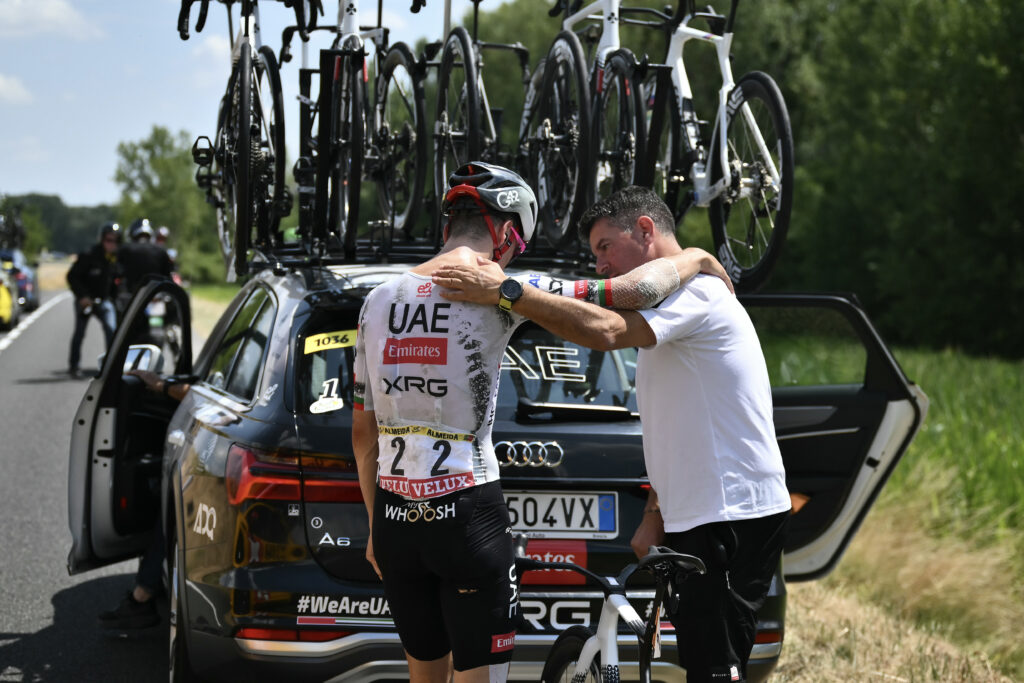 Tadej Pogacar a perdu son principal lieutenant sur le Tour de France avec l’abandon dimanche de Joao Almeida lors de la 9e étape entre Chinon et Châteauroux, deux jours après être lourdement tombé.Le Portugais de 26 ans, quatrième du Tour l’an dernier, souffre d’une fracture sans complications à une côte et d’abrasions sur le corps après avoir été pris dans une grosse chute collective vendredi peu avant l’arrivée à Mûr-de-Bretagne.Le coureur d’UAE a serré les dents samedi lors de la 8e étape mais, dimanche, il a mis pied à terre à environ 80 km de l’arrivée après avoir traîné en queue de peloton dès le départ de Chinon.”Je suis tombé un peu malade aussi il y a deux, trois jours donc ce n’est vraiment pas idéal. Je vais faire de mon mieux”, avait-il expliqué peu auparavant.C’est un gros coup dur pour le maillot jaune qui comptait dans la montagne sur le Portugais, en grande forme cette saison avec trois victoires dans une course d’une semaine, dont le Tour de Suisse juste avant la Grande Boucle.”Il est impressionnant”, avait déclaré samedi soir Pogacar en louant le courage d’Almeida avant d’ajouter, prophétique: “demain (dimanche), ce sera probablement pire encore car c’est souvent le deuxième jour après la chute qu’on souffre le plus.””Pogi” devra donc faire sans son principal lieutenant en montagne face à l’équipe Visma de Jonas Vingegaard, qui présente plusieurs grimpeurs redoutables dans son effectif.