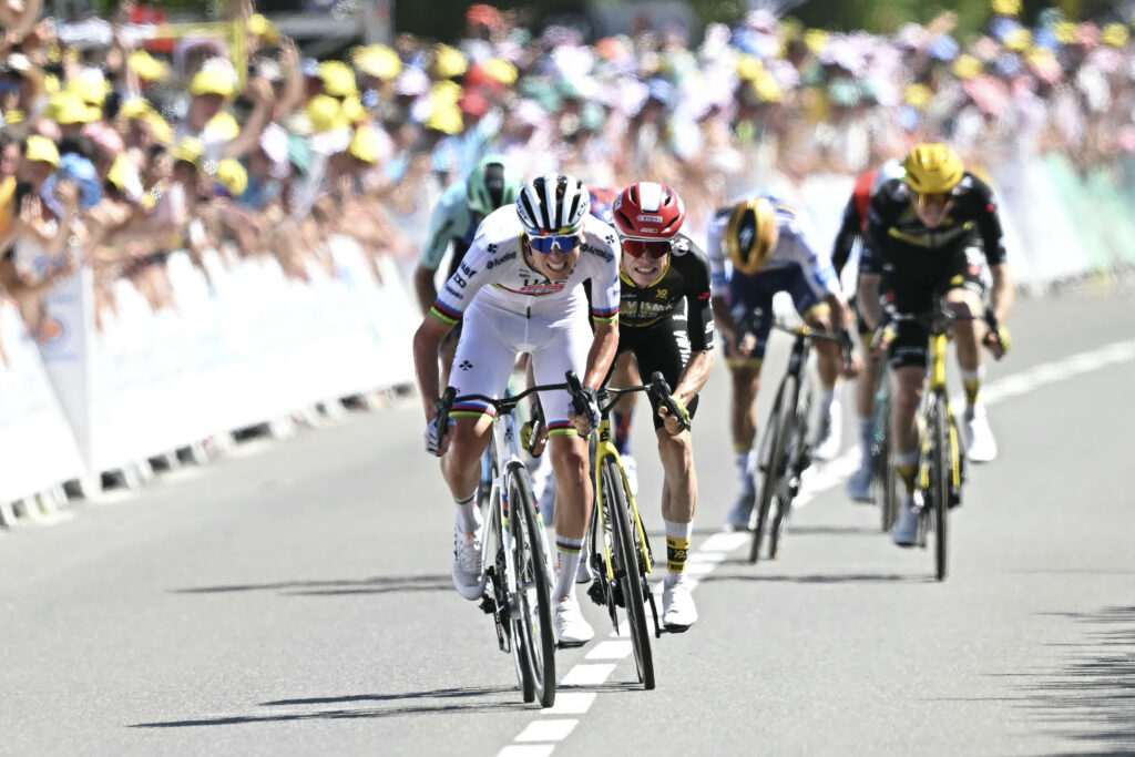 Vainqueur facile à Mûr-de-Bretagne, Tadej Pogacar a encore vécu une journée “presque parfaite” vendredi sur le Tour de France, si ce n’est la lourde chute de son principal lieutenant, Joao Almeida, qui souffre d’une fracture à une côte mais devrait continuer.Intouchable dans ce genre de final, au sommet d’un mur bien raide, le champion du monde a réglé au sprint un groupe de huit coureurs pour s’imposer sans discussion possible devant Jonas Vingegaard et reprendre le maillot jaune à Mathieu van der Poel, absent des débats.Il y a quatre ans, le Néerlandais avait vécu une journée magique en levant les bras au sommet de cet “Alpe d’Huez breton”, devant Pogacar, pour endosser le maillot jaune que son grand-père Raymond Poulidor, décédé quelques mois plus tôt, n’avait jamais réussi à prendre.Mais, vendredi, au lendemain de ses gros efforts fournis dans l’échappée vers Vire, le triple vainqueur de Paris-Roubaix était complètement à sec, se garant dès le pied de la montée. “Je me doutais bien que j’allais perdre le maillot jaune aujourd’hui mais c’était quand même spécial de revenir ici”, a-t-il dit.L’absence de “MVDP” a ouvert un boulevard à Pogacar, qui regrettait presque de ne pas avoir eu droit à sa revanche à la régulière. “Il avait sans doute laissé trop de forces” la veille, a constaté le Slovène.Pour lui, en revanche, “tout a marché comme prévu”, a-t-il ajouté, face à l’évidence de son attaque irrésistible aux 200 mètres. Elle a laissé tout le monde sur place, même si Vingegaard a lui aussi semblé très à l’aise pour repousser Remco Evenepoel et les jeunes loups Oscar Onley et Kévin Vauquelin, à nouveau présents dans le final.- “Un luxe” d’avoir Almeida -“Je suis super content de gagner dans cette montée emblématique”, a ajouté Pogacar, déjà vainqueur mardi à Rouen, qui signe en Bretagne sa 101e victoire, la 19e sur le Tour, creusant son avance en tête du classement général – 54 secondes sur Evenepoel, 1:11 sur Vauquelin et 1:17 sur Vingegaard.”Une journée presque parfaite”, a-t-il résumé.Seulement “presque” car une grosse ombre a obscurci la fin d’après-midi de l’équipe UAE avec la chute de Joao Almeida. Le Portugais a violemment tapé le bitume dans une descente à six kilomètres de l’arrivée en compagnie d’une dizaine de coureurs dont Jack Haig, contraint à l’abandon, et Louis Barré, qui a fini la fesse gauche complètement en sang.Almeida, qui a franchi la ligne avec plus de dix minutes de retard, souffre d’une “fracture sans complications à une côte” ainsi que d'”abrasions profondes sur le corps”, a annoncé son équipe en début de soirée. “Les prochains jours seront difficiles pour lui mais, à ce stade, il devrait être en mesure de prendre le départ de l’étape demain”, a ajouté l’équipe.Reste que cette chute élimine le Portugais de la course au podium pour lequel il était un candidat sérieux. Cela prive la formation UAE d’un atout susceptible de brouiller les cartes dans sa guéguerre avec l’équipe Visma de Vingegaard, où Matteo Jorgenson occupe une fonction similaire, à la fois meilleur équipier et principal leurre.”C’était un luxe de l’avoir dans la discussion pour le général, d’autant qu’il était en grande forme”, a déploré Pogacar.- Costiou s’est fait plaisir -Même s’il n’a peut-être besoin de personne tellement il domine, le Slovène sait qu’il peut s’appuyer sur une armada redoutable et a longuement chanté les louanges de ses coéquipiers.Tim Wellens? “Un formidable capitaine de route, un gars unique sur le vélo et en dehors.” Jhonatan Narvaez? “Précieux dans le dernier kilomètre.” L’Allemand Nils Politt? “Une machine à contrôler l’échappée, même quand elle roule aussi vite qu’aujourd’hui.”L’étape, courue devant une foule immense, a de fait été avalée à toute vitesse par le peloton qui a atteint une moyenne de plus de 50 km/h lors des deux premières heures.Une échappée de cinq coureurs a fini par se dégager avec Alex Baudin, Geraint Thomas, le doyen de ce Tour, Marco Haller, Ivan Garcia Cortina et le Breton Ewen Costiou.Ce dernier s’est fait plaisir en sortant de l’échappée pour faire seul en tête la première ascension du mur final, devant un public en ébullition, avant d’être repris.Les deux prochaines étapes, promises aux sprinteurs, devraient être “plus calmes”, a espéré Remco Evenepoel, selon qui “le Tour n’est pas encore fini”.Mais Pogacar est quand même bien lancé et comme le disait le sprinteur érythréen Biniam Girmay: “A ce rythme il devient aussi le favori pour le maillot vert.”