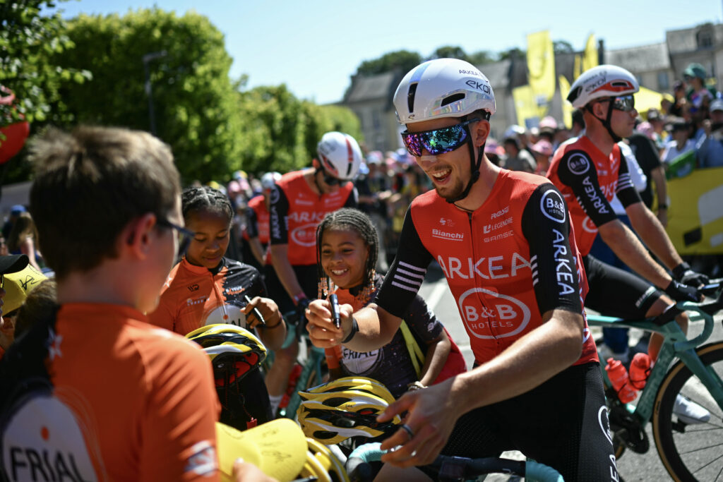 Malgré une nouvelle journée sans victoire vendredi, les espoirs français au Tour de France ont encore été brillamment incarnés par Kévin Vauquelin, troisième au classement général et qui enjolive le maigre bilan tricolore jusque-là en emportant la foule avec lui.”Là, je fais du vélo, pour changer un peu…”: perché sur son home-trainer après avoir récupéré cette troisième place au soir de la septième étape, le Normand prend le temps de plaisanter avec ses supporters, de rendre les sourires au public plus nombreux chaque soir devant le car d’Arkéa-B&B Hotels et d’échanger avec son père.Septième de l’étape, après deux montées ébouriffantes de la côte de Mûr-de-Bretagne, Vauquelin a tenu tête aux favoris, et est même remonté au classement en profitant du jour sans de Mathieu van der Poel.Pris dans une petite cassure au début de la deuxième ascension, le Français a souffert face au train des UAE de Tadej Pogacar, mais ne termine qu’à deux secondes du maillot jaune slovène.- “Une dinguerie” -Et même si le peloton a quitté sa Normandie natale pour venir s’échiner sur les routes tortueuses de Bretagne, il a une fois de plus été acclamé, confirmant un statut tout nouveau qui se renforce chaque jour dans l’esprit du public.Récemment, “il a fait deuxième au Tour de Suisse, mais il a gagné le coeur des Français”, déclare à l’AFP son père Bruno, les yeux encore rougis par les larmes de longues minutes après la fin de l’étape.Comme son père, sans cesse étonné par la tournure des événements et l’engouement, le coureur de 24 ans vit “une dinguerie”: “C’est une vraie folie, j’ai vu encore des pancartes avec ma tête quand j’étais en +full lactic+ (une référence à l’acide lactique produite durant un effort violent, NDLR), ça me donne juste envie de me surpasser encore plus”.Porté par les encouragements, il apprend également à toute vitesse dans le rôle de coureur du classement général, presque malgré lui.”Il faut que ce début de Tour de France me serve vraiment pour l’avenir, la notoriété dans le peloton me permet de me placer un peu plus à l’avant, ça me permet d’être au contact des meilleurs”, analyse-t-il.”En jouant les premiers rôles à chaque fois, mon corps s’améliore, c’est pour ça qu’on voit Jonas (Vingegaard), Remco (Evenepoel) ou même Tadej (Pogacar) s’améliorer d’année en année”, estime Vauquelin.”C’est vrai qu’il est très fort, dans son corps et dans sa tête, il va en claquer une!”, prédit son père. Cela ferait un bien fou à un cyclisme français qui tourne autour d’une victoire d’étape depuis le grand départ de Lille avec six Top 5 mais aucun podium. Ils se sont encore montrés vendredi dans les pentes sévères d’un final a priori destiné aux puncheurs, où Romain Grégoire, cité parmi les prétendants, a souffert. “Ca a fait le pied à bloc directement, ça avantage les meilleurs coureurs”, a dit le coureur de Groupama-FDJ après la course, sans se dire résigné face à la domination de Pogacar.- “Pas le même vélo” -“On n’est pas étonné, ça fait quelques mois, quelques années qu’on vit ça”, a affirmé le Bisontin de 22 ans, finalement 13e, derrière Axel Laurance (9e) et le coureur de TotalEnergies Jordan Jegat.”La première (ascension), je savais que ça allait monter vite, mais à ce point-là, je ne m’y attendais pas”, a expliqué Jegat. “Et après, une fois que j’ai réussi à recoller aux favoris, franchement, c’est pas le même vélo quand on est dans la roue de Pogacar et compagnie”, a-t-il poursuivi.Le Breton Ewen Costiou avait lui tenté de prendre les devants devant son public pour “une journée inoubliable”, avant d’être pris dans une chute collective en fin d’étape. Sans gravité pour lui, le gadin a coûté plus cher à d’autres Français, bien égratignés comme Louis Barré ou Guillaume Martin-Guyonnet.Ils auront deux jours, réservés aux sprinteurs, pour se retaper. Avant de repartir à la chasse aux étapes, dans le sillage de Vauquelin.