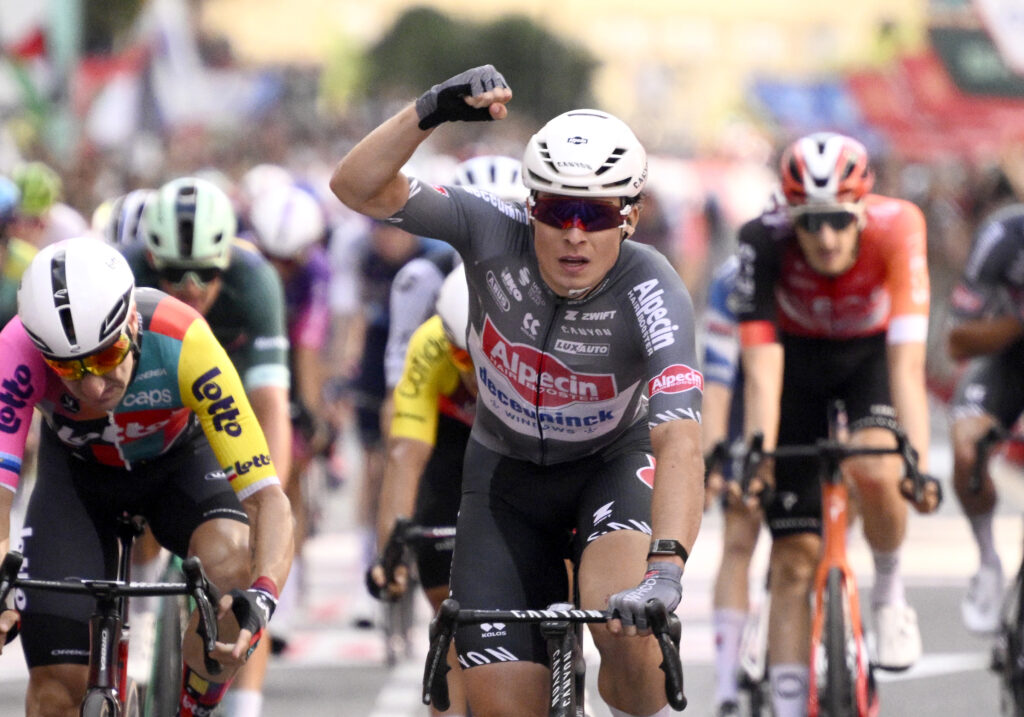 Et de deux pour Jasper Philipsen. Le Belge, déjà vainqueur de l’étape inaugurale en Italie, a récidivé samedi à Saragosse en remportant le sprint, chahuté, de la 8e étape du Tour d’Espagne.A l’issue d’un emballage massif marqué par une prise de risque d’Elia Viviani, auteur d’un écart dangereux, le coureur de l’équipe Alpecin a devancé le Britannique Ethan Vernon.Deuxième sur la ligne, Viviani a été déclassé (placé par les commissaires en 105e position), à l’instar du Français Bryan Coquard, 106e alors qu’il avait franchi l’arrivée en 6e place.Le Norvégien Torstein Træen (Bahrain) a conservé le maillot rouge de leader devant le Danois Jonas Vingegaard, grand favori de cette Vuelta et jamais mis en difficulté samedi.Au contraire, Juan Ayuso et David Gaudu, retardés, ont connu une journée de galérien alors que le parcours ne présentait pourtant aucune difficulté.Pointé parmi les favoris au départ samedi dernier, l’Espagnol, vainqueur la veille dans les Pyrénées, a dit adieu à tout espoir de podium en pointant à près de 13 minutes de la tête, en 33e position.Quant au Français de la Groupama-FDJ, grand animateur des premières étapes et porteur du maillot rouge en début de semaine, il accuse désormais près de 20 minutes de retard sur Træen.- Nouvelle arrivée au sommet dimanche -Pour Philipsen, il s’agit de la 15e victoire d’étape sur un grand Tour: dix au Tour de France, et cinq désormais sur la Vuelta.”Ce Tour d’Espagne n’a vraiment pas été dessiné pour les sprinteurs. On souffre beaucoup en montagne, ce qui rend ces succès d’étape particulièrement savoureux. On sait pourquoi on s’accroche dans les côtes”, a commenté le Belge de 27 ans au micro de l’organisation.”J’ai perdu la roue de mes équipiers dans les derniers hectomètres. C’est dommage car ils avaient effectué le travail parfait. Heureusement, j’ai pu prendre la roue de Bryan Coquard qui a lancé de loin et j’ai réussi à me faufiler pour m’imposer”, a-t-il ajouté.Le Flamand a fait une bonne opération dans la lutte pour le maillot vert. Le leader de ce classement par points Mads Pedersen a en effet manqué son sprint (11e) et, avec 117 points, voit Vernon (108) et Philipsen (105) se rapprocher, alors que les dix prochaines étapes ne favoriseront pas les purs sprinteurs.L’étape, plate comme une mer d’huile, sans vent, a à peine été animée par l’échappée de trois hommes.Partis dès les premières minutes de courses, les Espagnols José Luis Faura, Sergio Samitier et Joan Bou se sont offert une escapade publicitaire condamnée à l’échec même si le trio a compté jusqu’à quatre minutes d’avance.Les trois aventuriers ont été repris à 10 km de la ligne dans les rues de la cité aragonesque.Après cette pause de 163 kilomètres, les coureurs doivent s’attendre à souffrir dimanche sur près de 200 km entre Alfaro et la station de ski de Valdezcaray.L’arrivée en côte au sommet d’un col de première catégorie, après plus de 3.000 mètres de dénivelé positif, pourrait faire bouger le classement général avant la première journée de repos lundi.